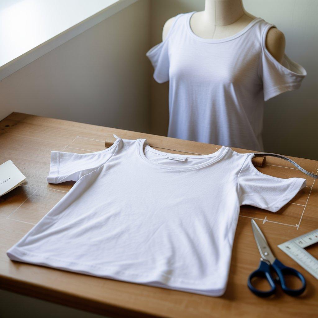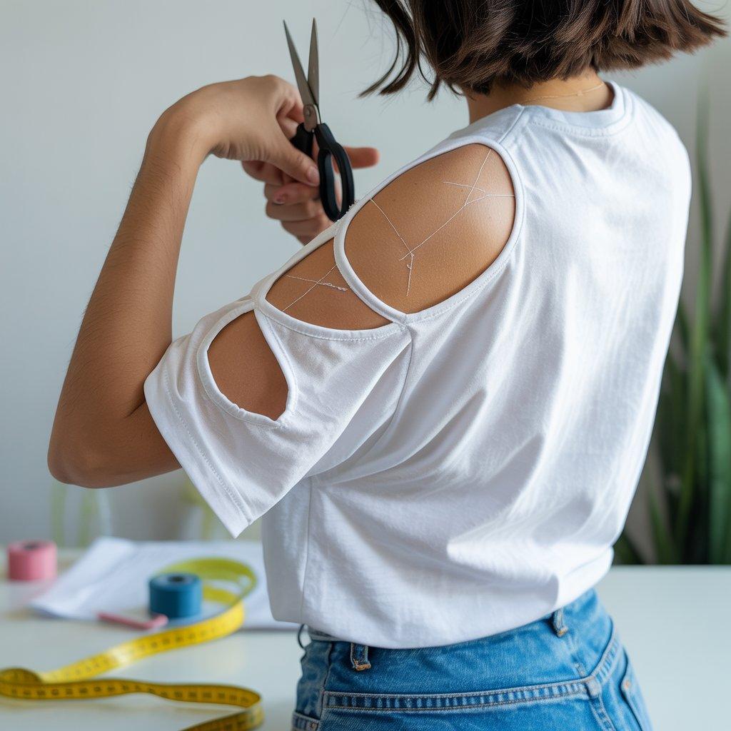 Changing the shape of the sleeves can make a plain T-shirt look more modern. One common idea is cutting the shoulder area to create an open or cold-shoulder style. This small change can make the shirt feel lighter and more comfortable, especially in warm weather.