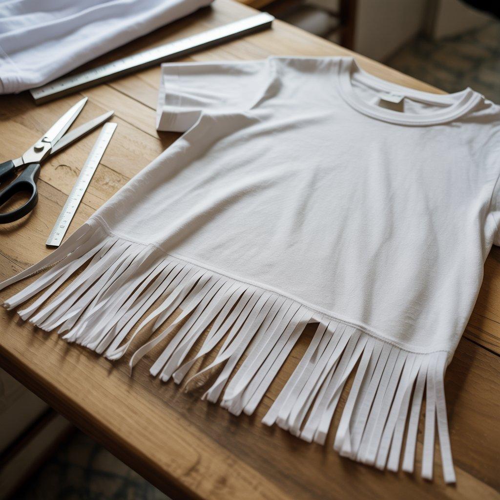 Fringe is created by cutting small strips along the bottom edge of the T-shirt. This adds movement and gives the shirt a more relaxed look. It is often used on casual clothing and can be adjusted depending on how long you cut the strips.
