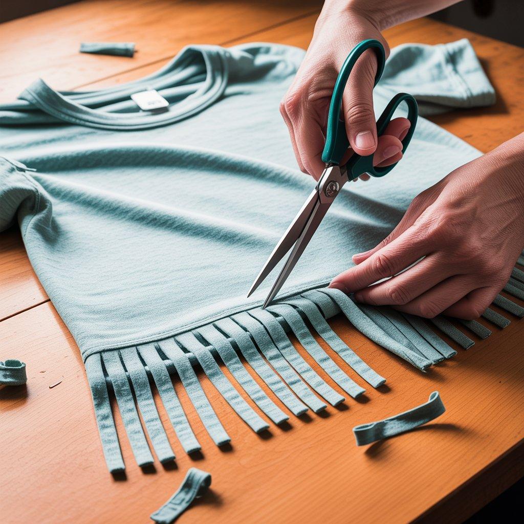 Lay the T-shirt flat and mark the length of the fringe. Cut vertical lines from the bottom edge upward, keeping the spacing even. Pull each strip gently so the edges curl slightly. This helps the fringe look softer instead of stiff.