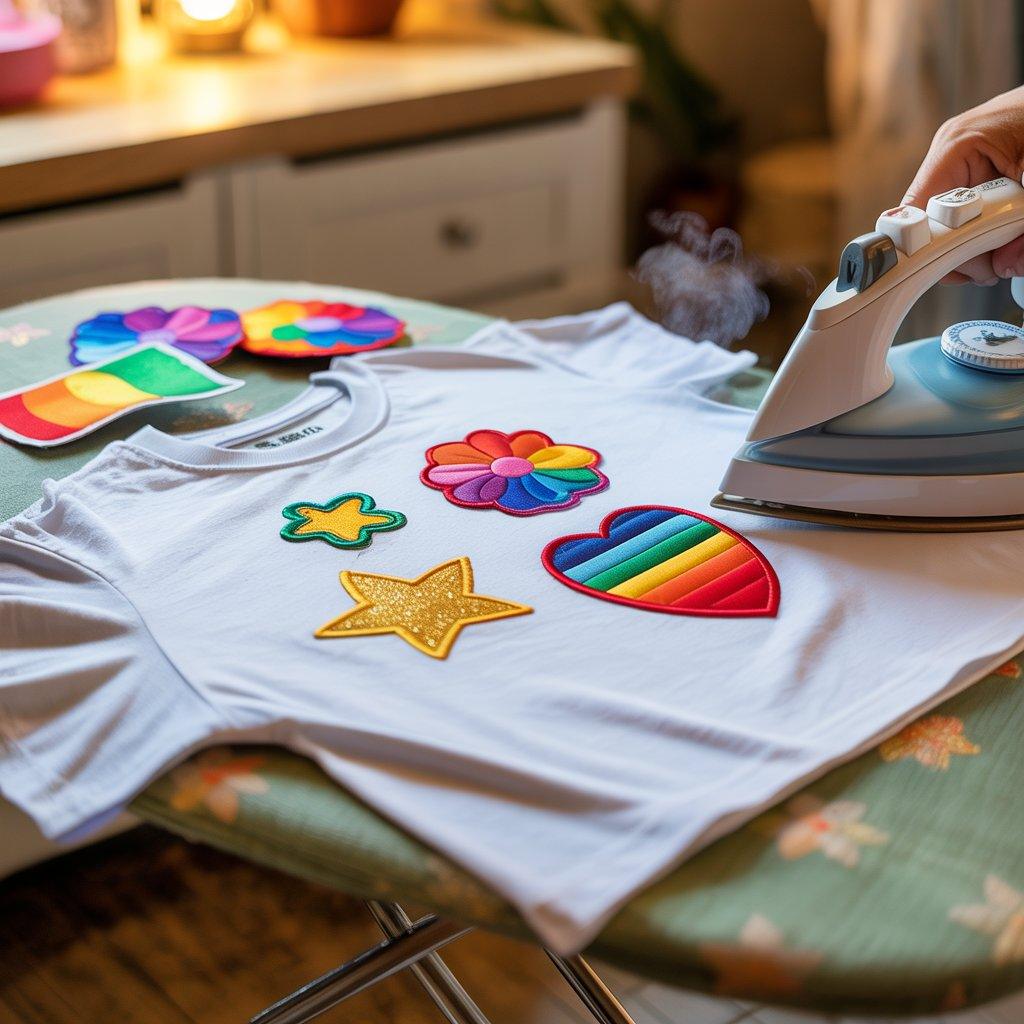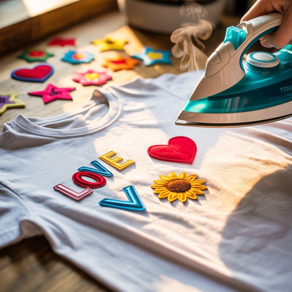 Iron-on patches are useful if your T-shirt has a small stain or if you want to add a small design detail. They are easy to use and available in many simple shapes like letters, flowers, or symbols.