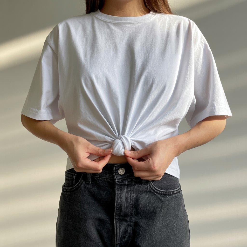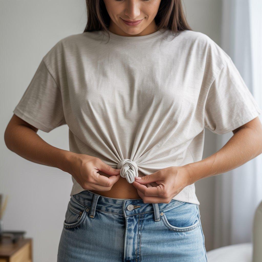 Wear the T-shirt and gently pull a small section of fabric at the front or side. Twist the fabric and tie it into a small knot. Adjust the tightness until the shirt feels comfortable. This creates a slightly shorter length and gives more shape to the outfit.