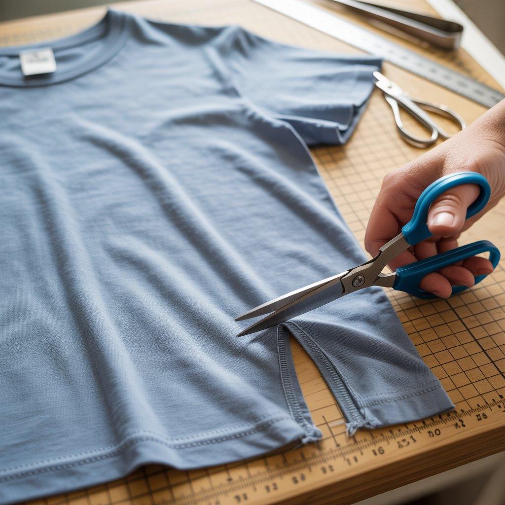 Use scissors to cut a small vertical opening on each side of the bottom hem. Start with a short cut, then increase the length if needed. Keep both sides equal so the shirt looks balanced.