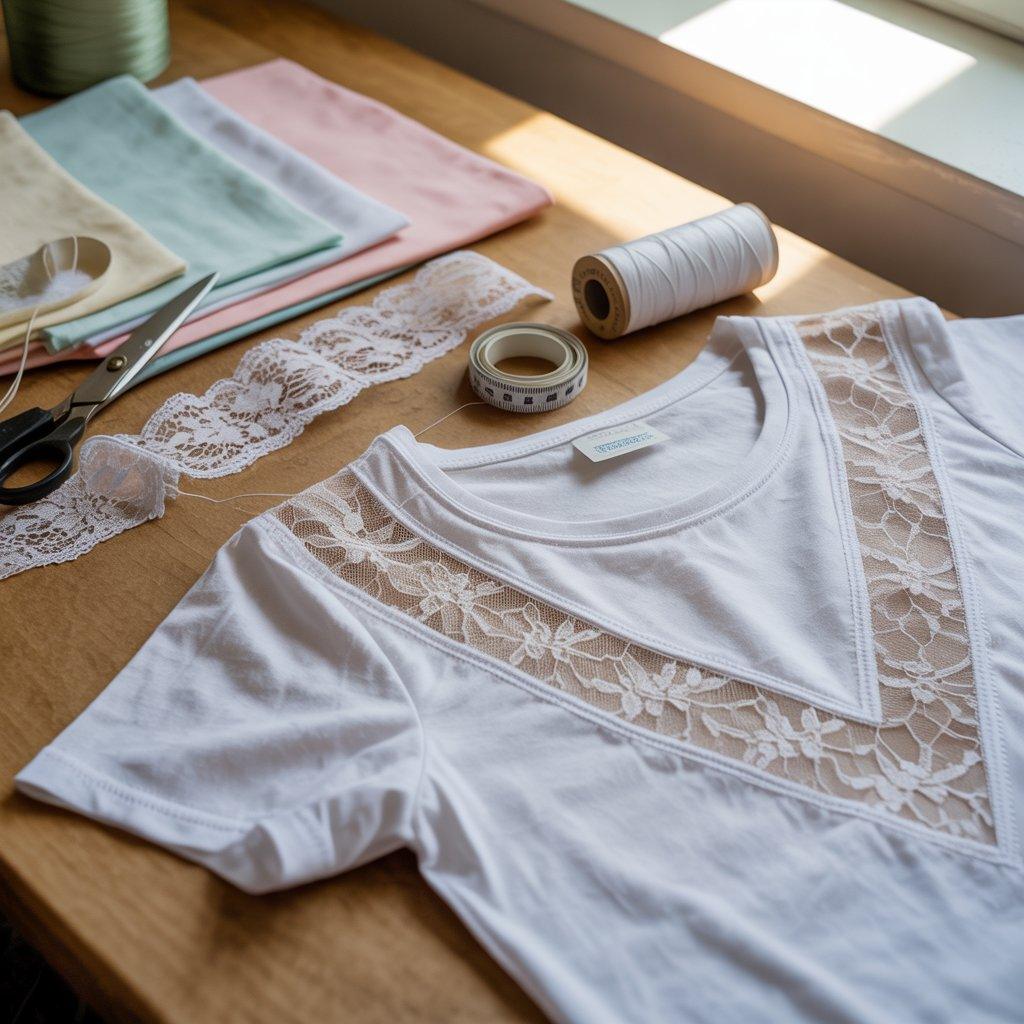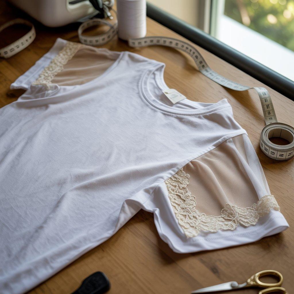Adding lace or a different fabric can change how a plain T-shirt looks and feels. Some people add lace to the sleeves, shoulders, or bottom edge of the shirt. Others replace a small section of the back with a light fabric panel.