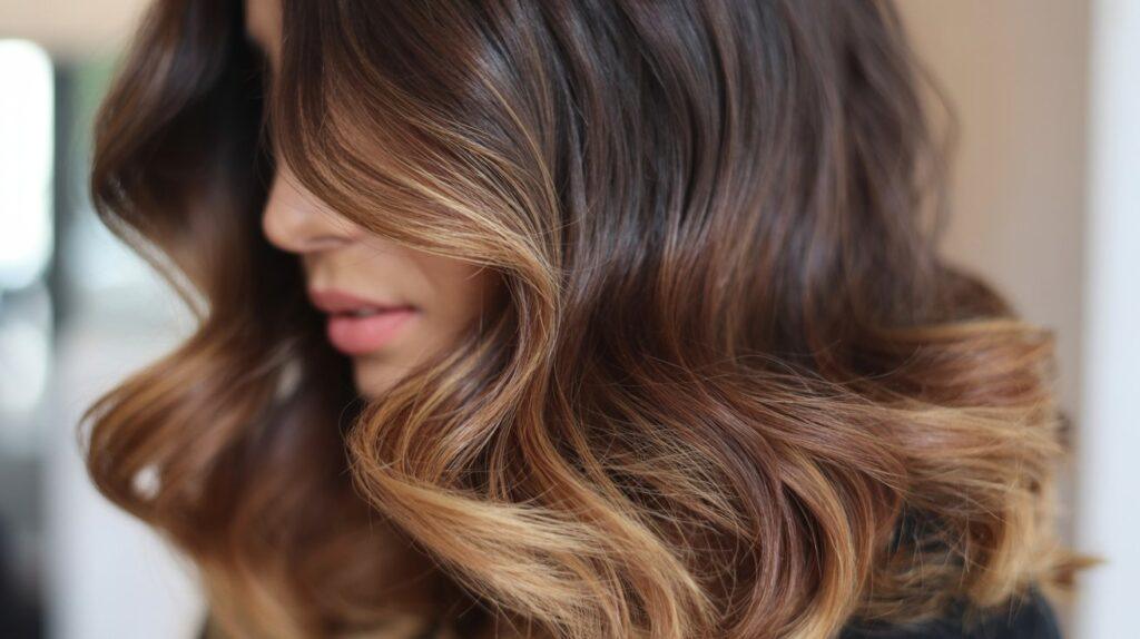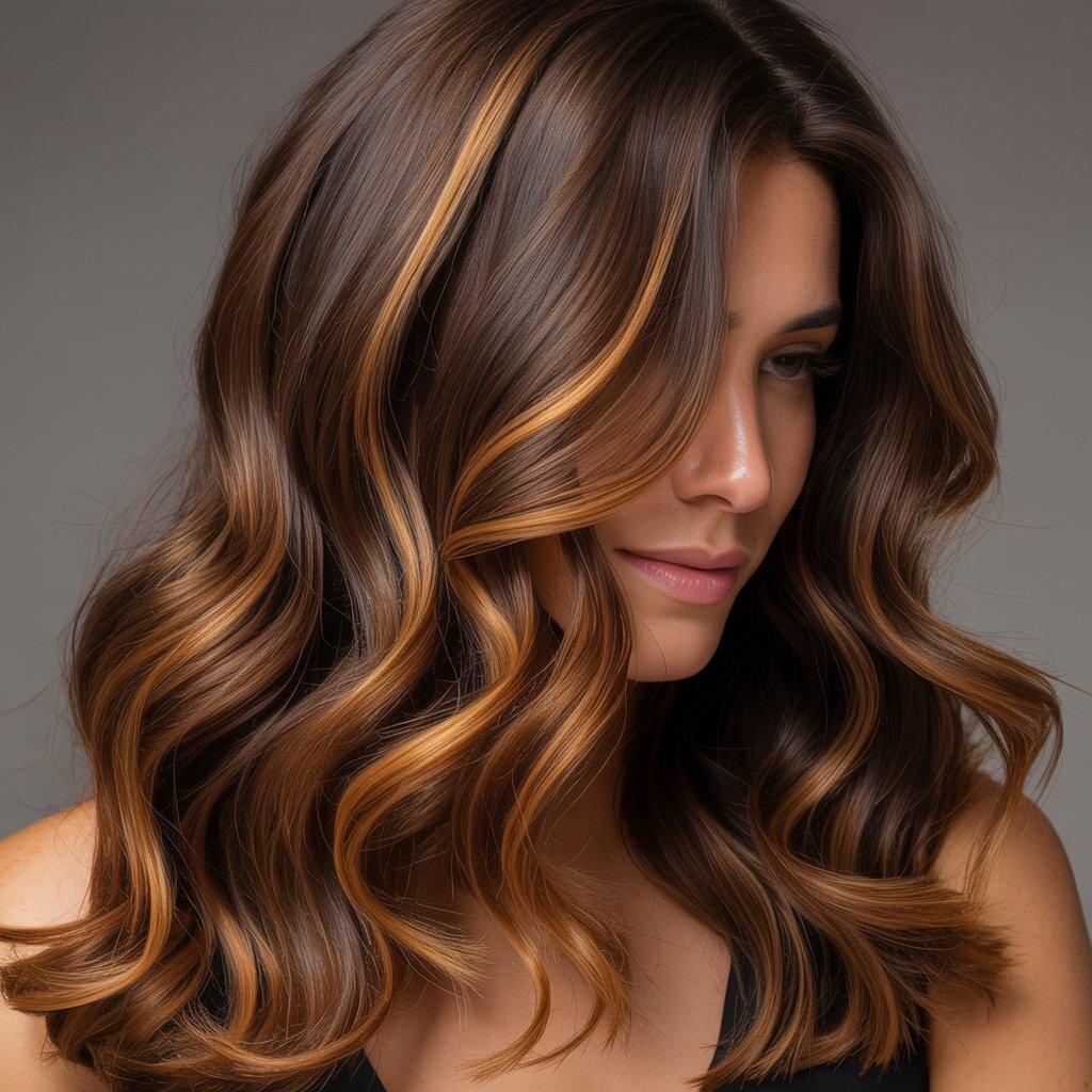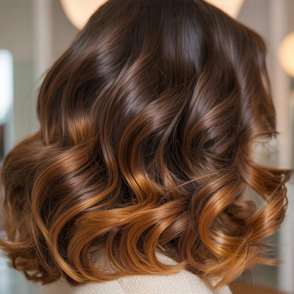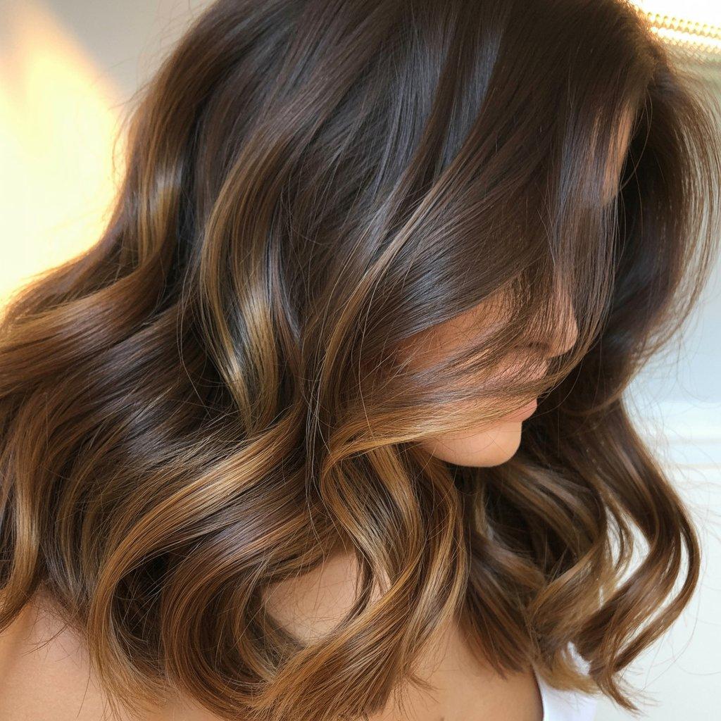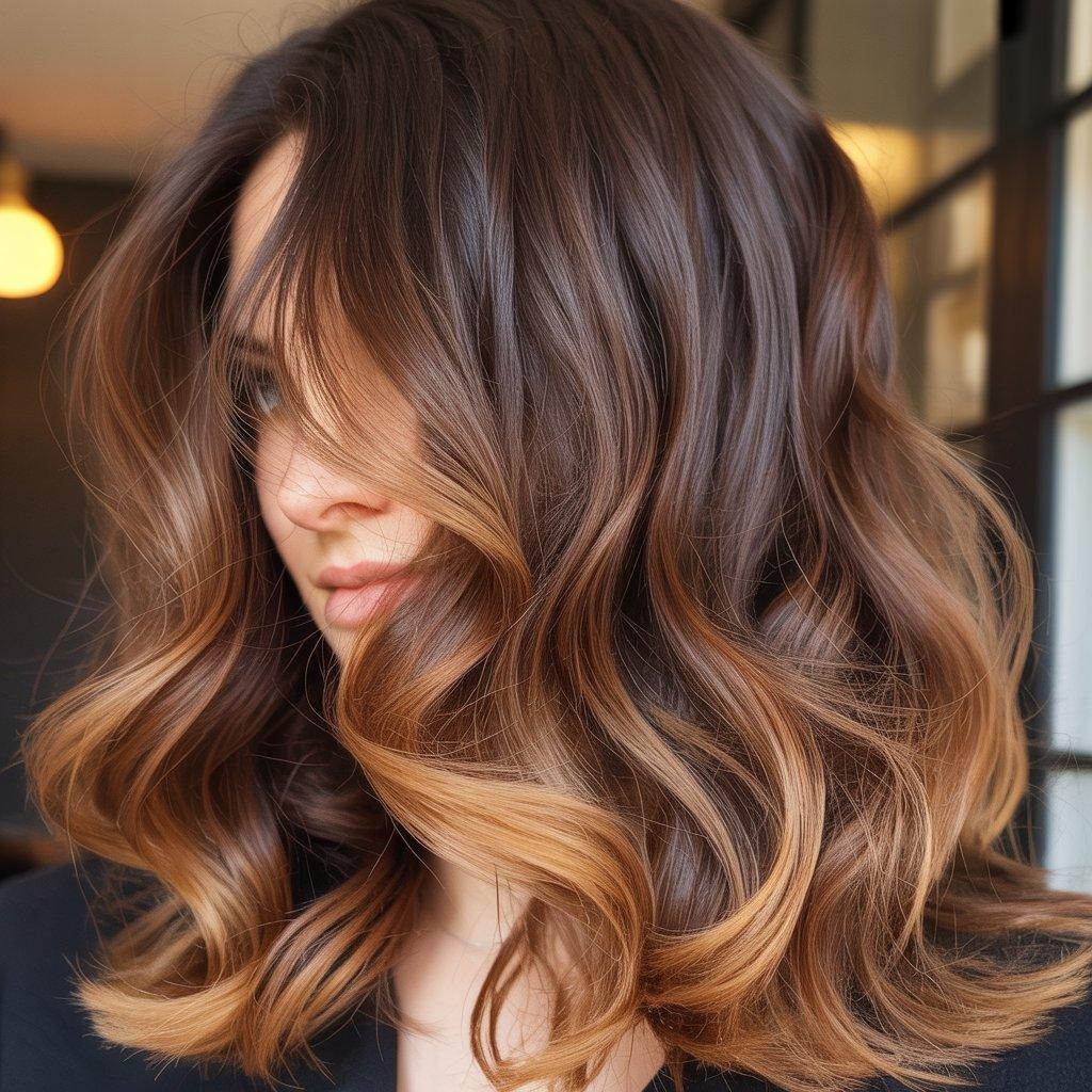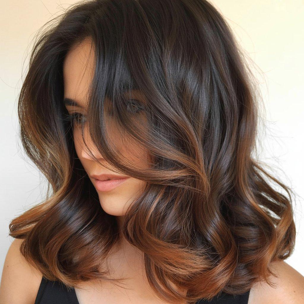 This balayage idea works well for medium and long hair because the extra length allows the color to transition smoothly. When styled with waves, the bronze pieces stand out even more and create movement throughout the hair.