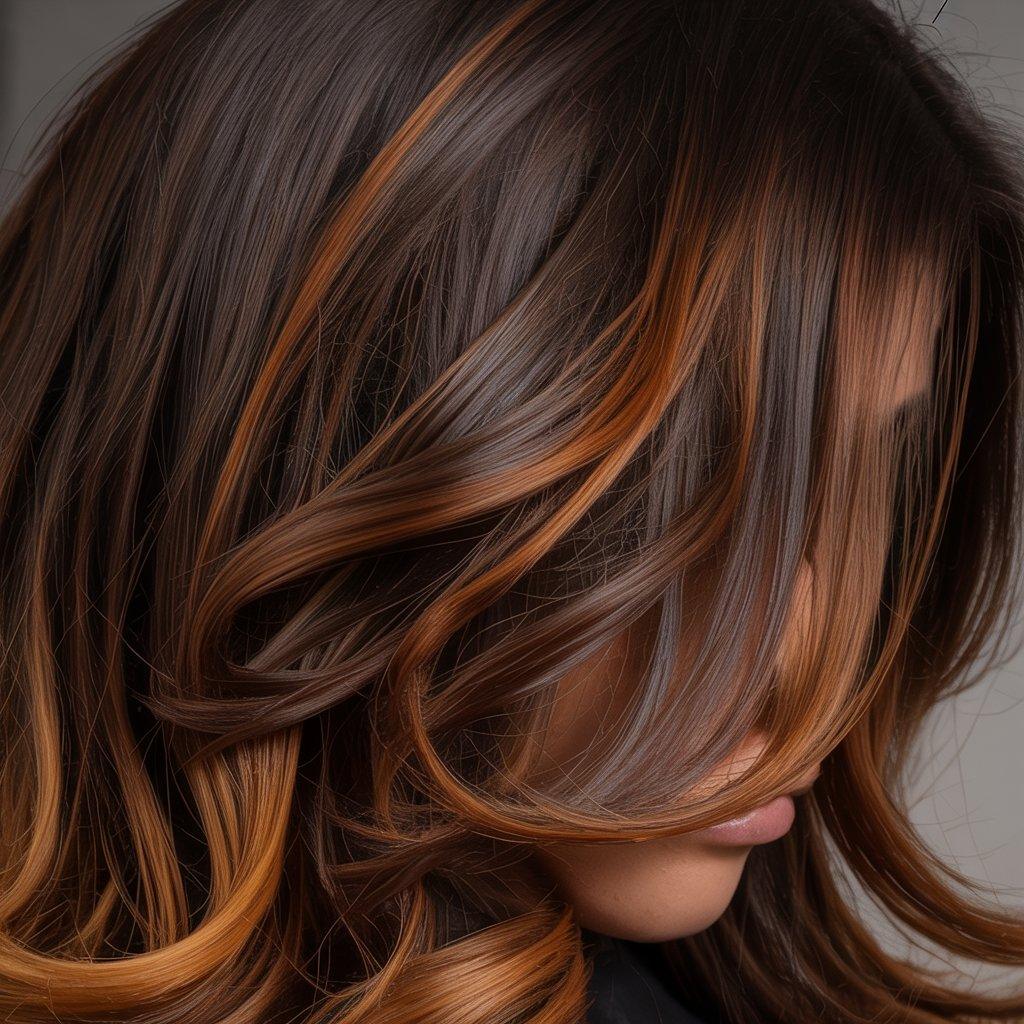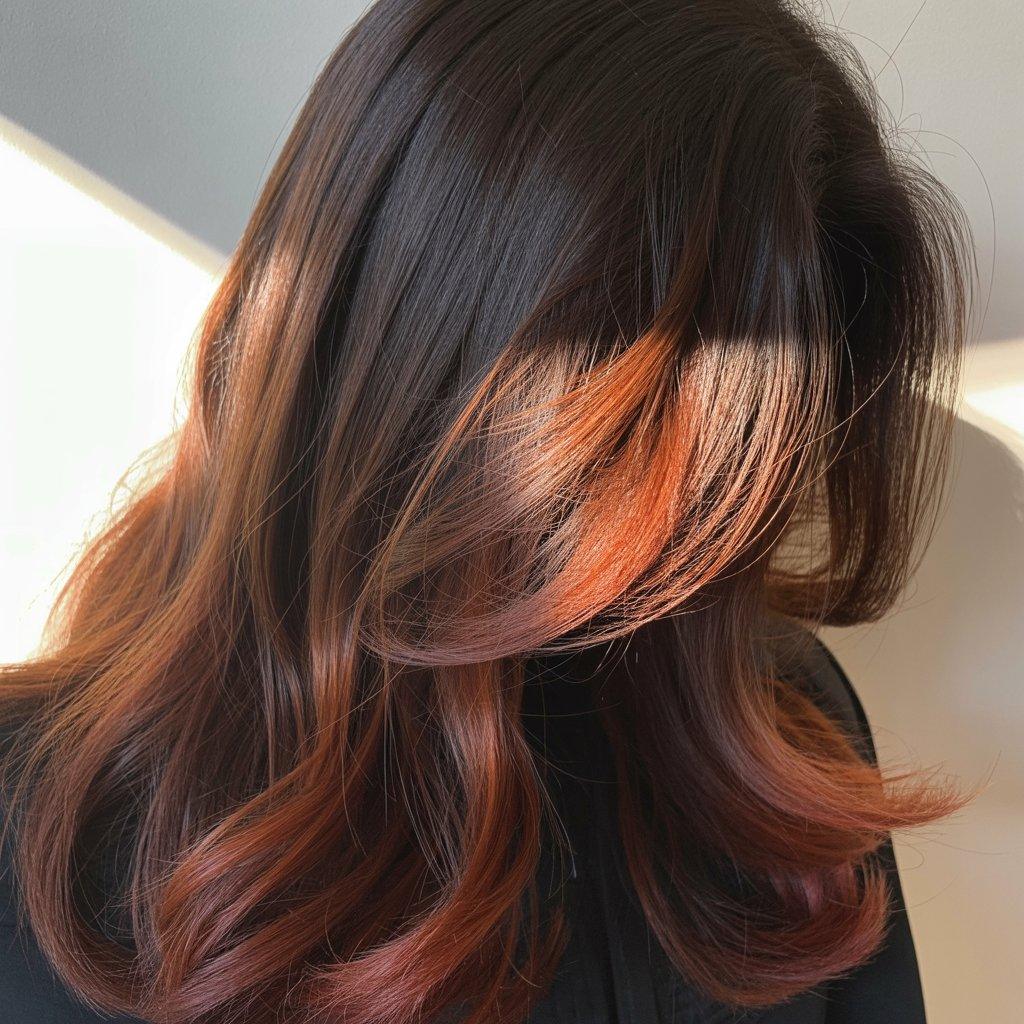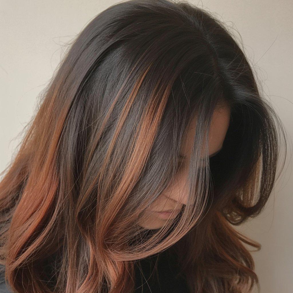 Soft copper balayage adds a warm glow that sits between orange and auburn tones. On dark hair, it doesn’t appear bright or fiery. Instead, it shows as a gentle warmth that gives the hair more depth and character.