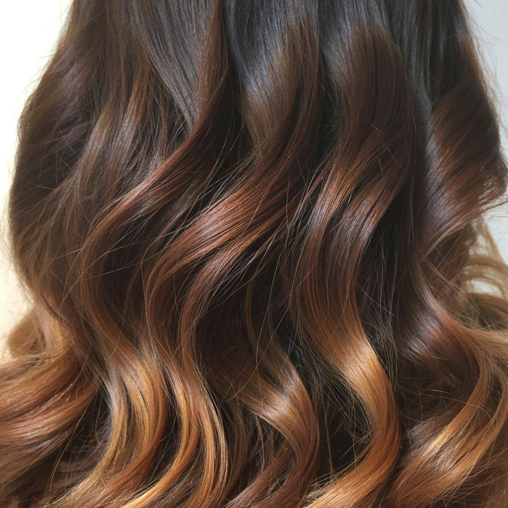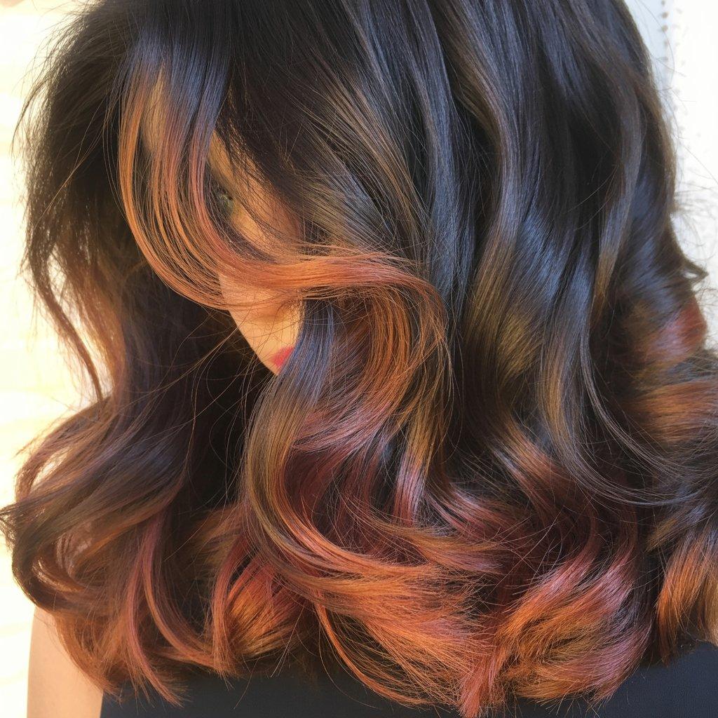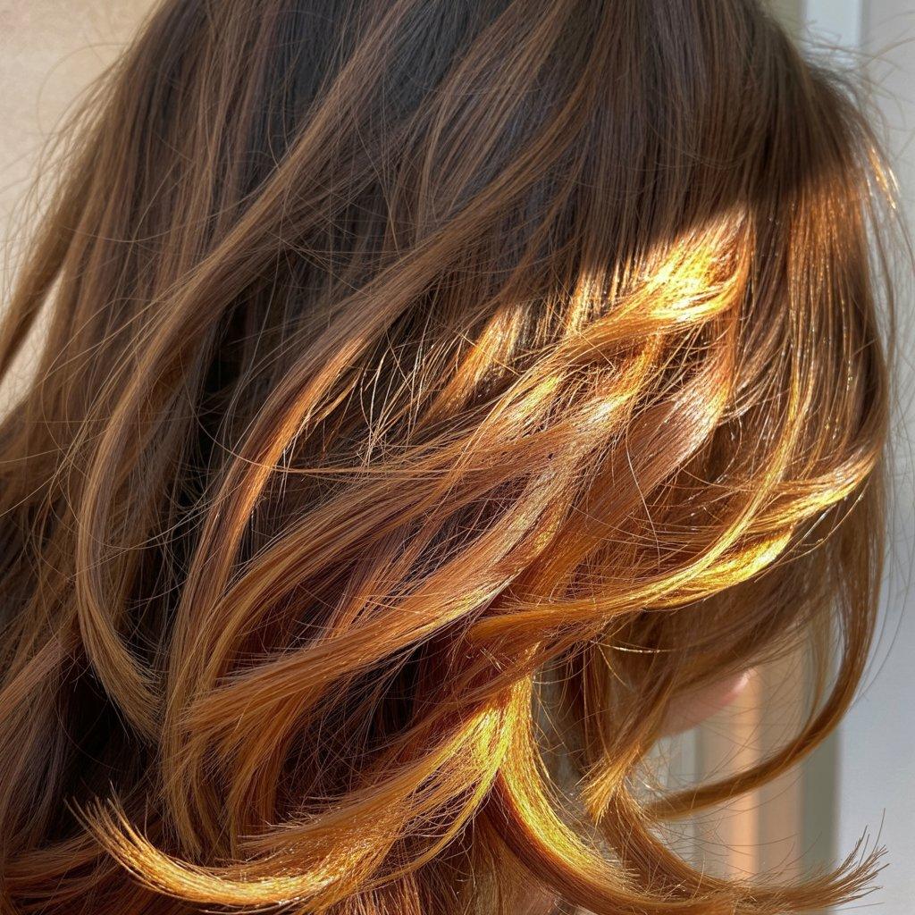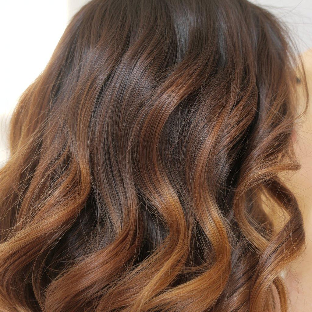 Soft copper balayage adds a warm glow that sits between orange and auburn tones. On dark hair, it doesn’t appear bright or fiery. Instead, it shows as a gentle warmth that gives the hair more depth and character.