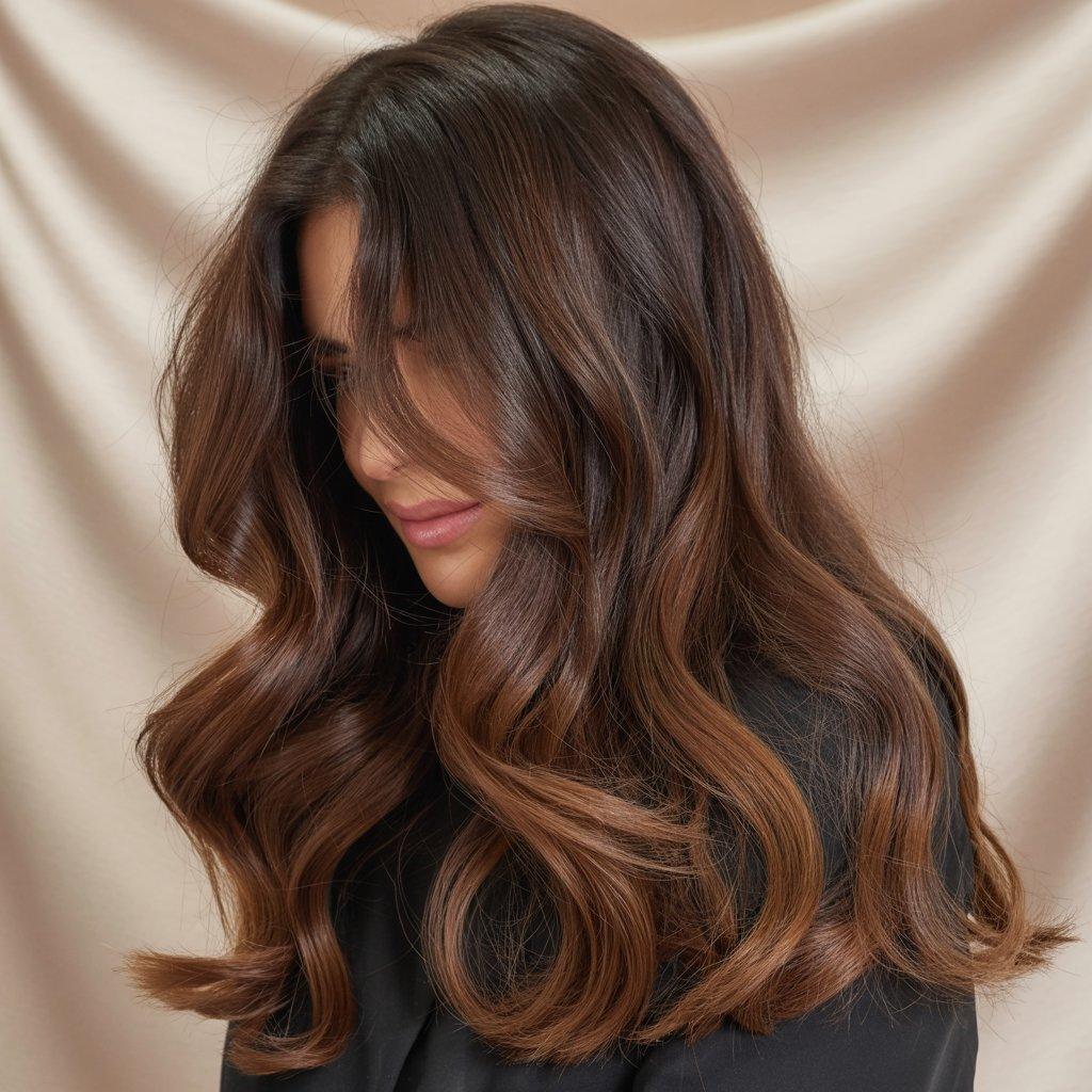 Cinnamon balayage brings a gentle reddish warmth into dark brown hair. The shade sits somewhere between soft auburn and warm brown, which makes it a good option if you want something richer but still natural.