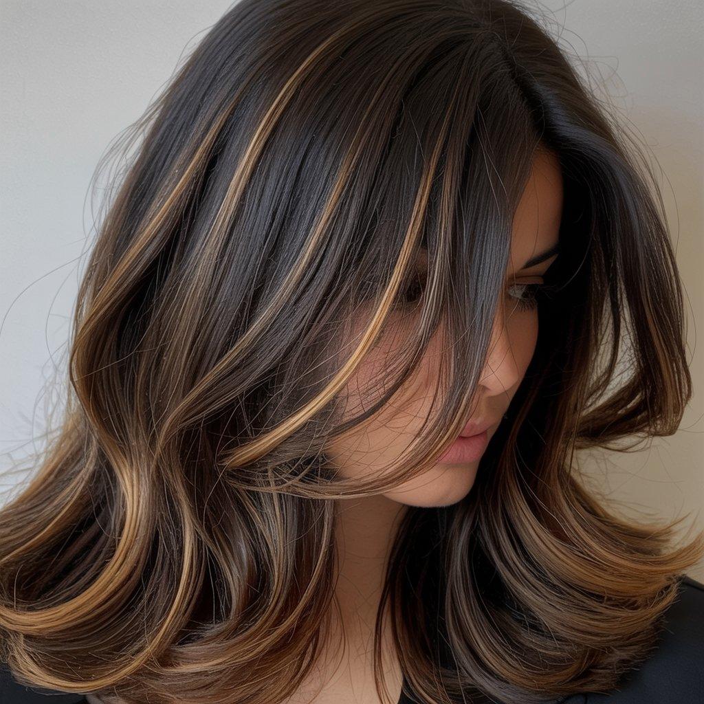 This technique works especially well on long layers or curtain bangs because the lighter sections move naturally with the hair. Even when the rest of the color stays dark, those caramel pieces add dimension and warmth.