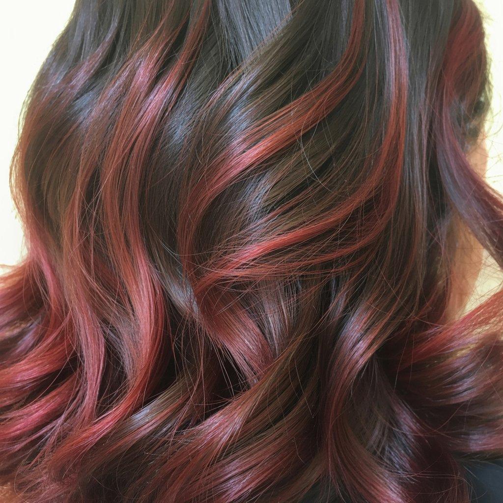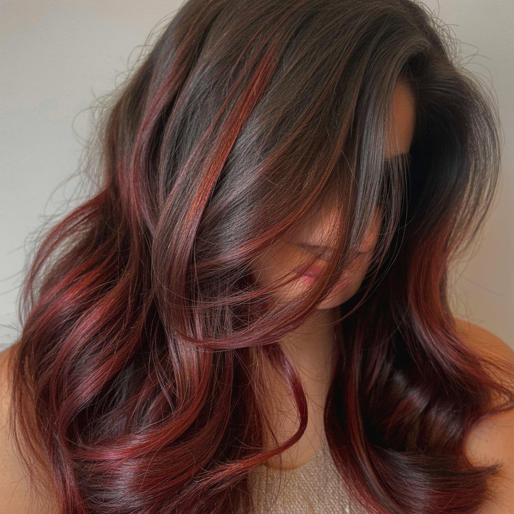 Mahogany balayage adds a deeper red-brown tone to dark hair. It’s richer than cinnamon and slightly darker than auburn, which makes it blend beautifully with deep brunette shades.