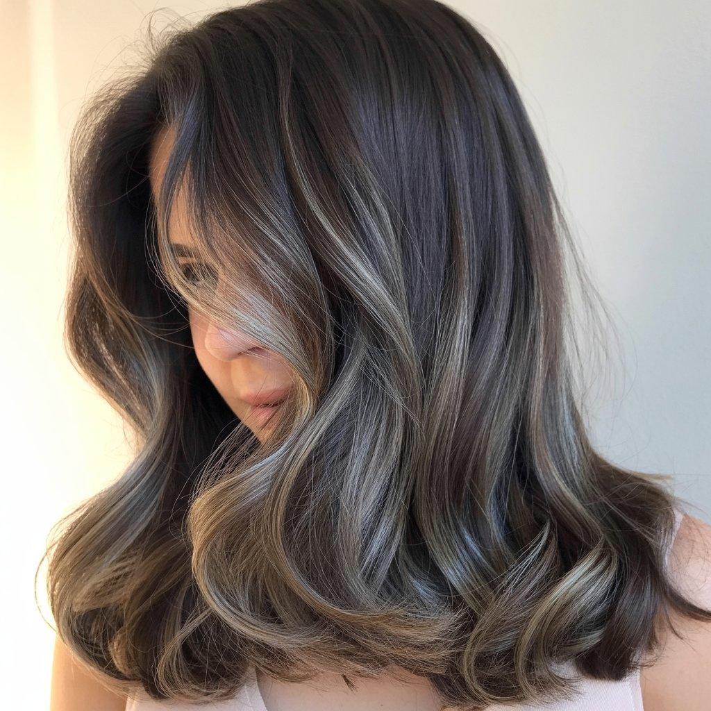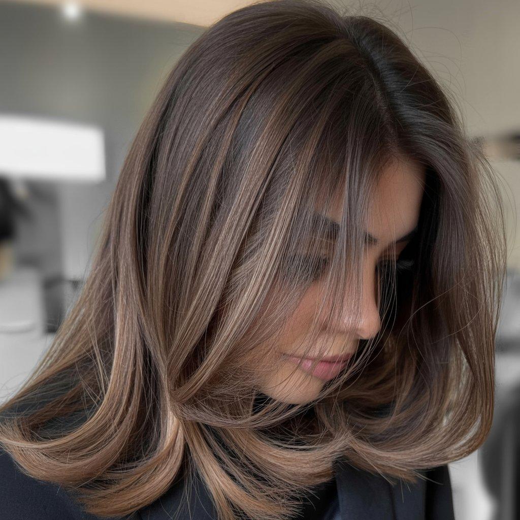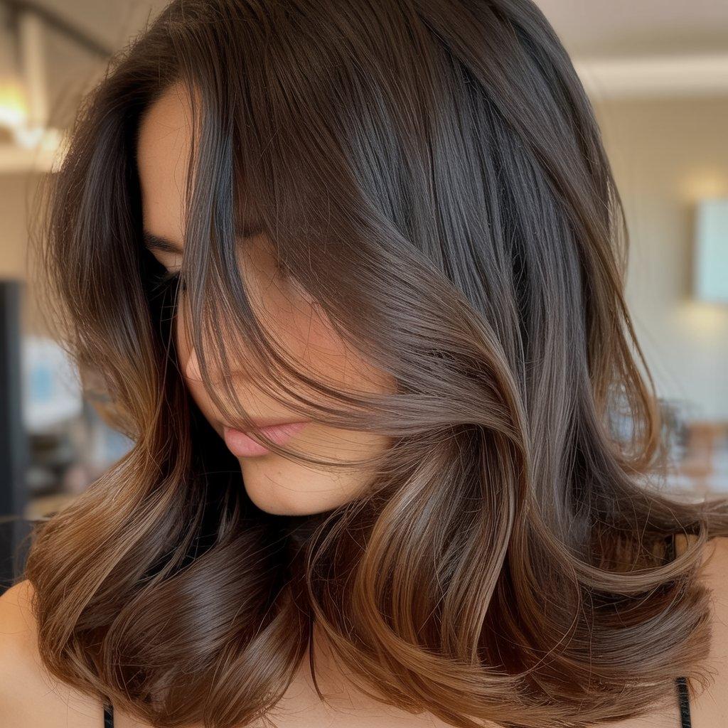 Mushroom brown balayage has become popular because it gives dark hair a cooler, earthy dimension. The shade is a blend of muted brown and soft gray tones, which creates a calm and natural look. Instead of adding warmth, this balayage focuses on cooler highlights that soften the overall color.