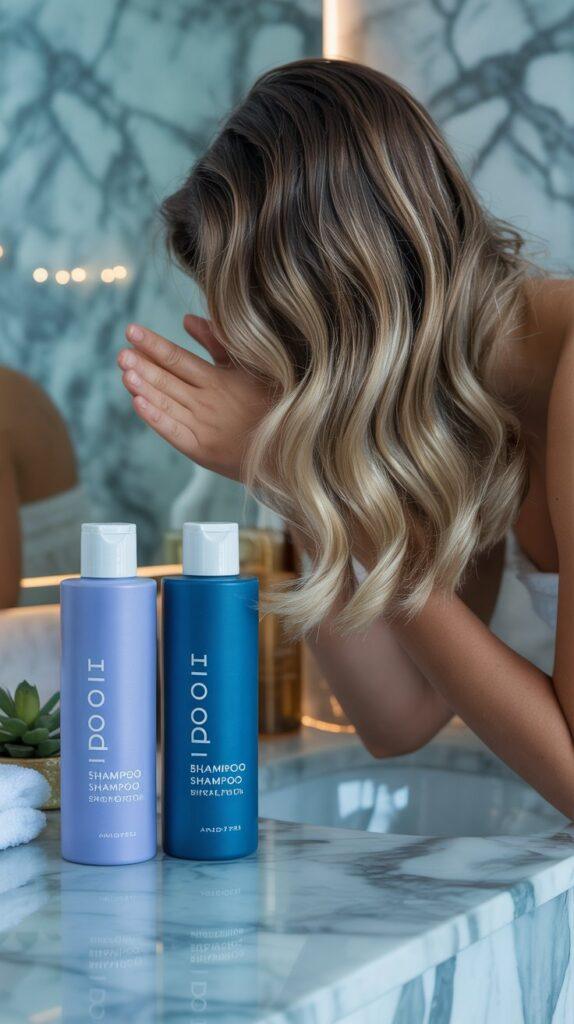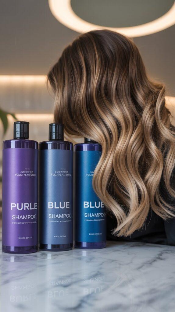 Once balayage highlights are in place, maintaining the tone becomes important. Purple or blue shampoos are commonly used to help control unwanted brassiness, especially when lighter pieces start to appear warmer over time.