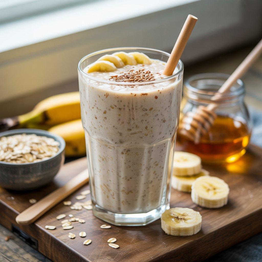 This smoothie is basically a drinkable bowl of oats. I blend cooked oats with milk, flaxseeds, a banana, and a bit of honey if needed. It’s gentle, filling, and supports long-lasting energy.