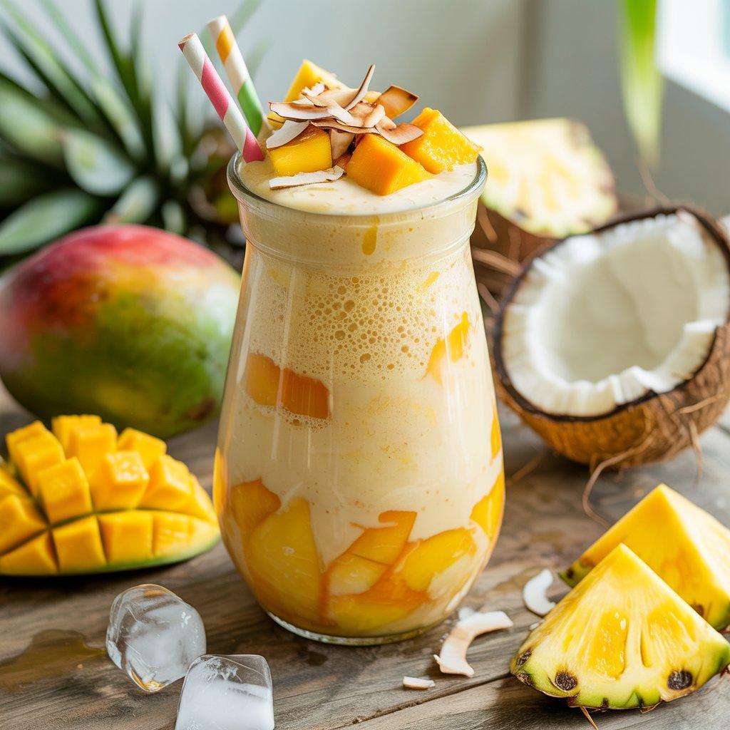 This smoothie is lighter but refreshing, especially on warm days when heavy meals feel like too much. I use plain yogurt, frozen mango or pineapple, and a splash of coconut water. Yogurt provides protein and gut support, which plays a bigger role in energy than many people realize.