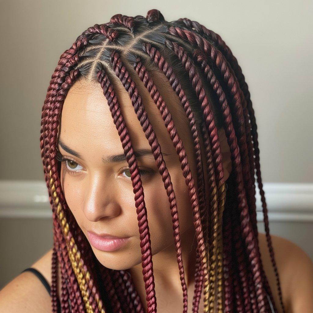 Jumbo box braids are a bold version of the classic box braid. I usually do thicker sections, which makes them faster to install and gives a dramatic, luxurious look. They’re perfect if you want a statement hairstyle that’s still low-maintenance. I like wearing them half-up, half-down, or twisting them into a high bun.
