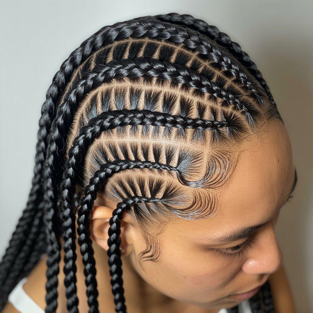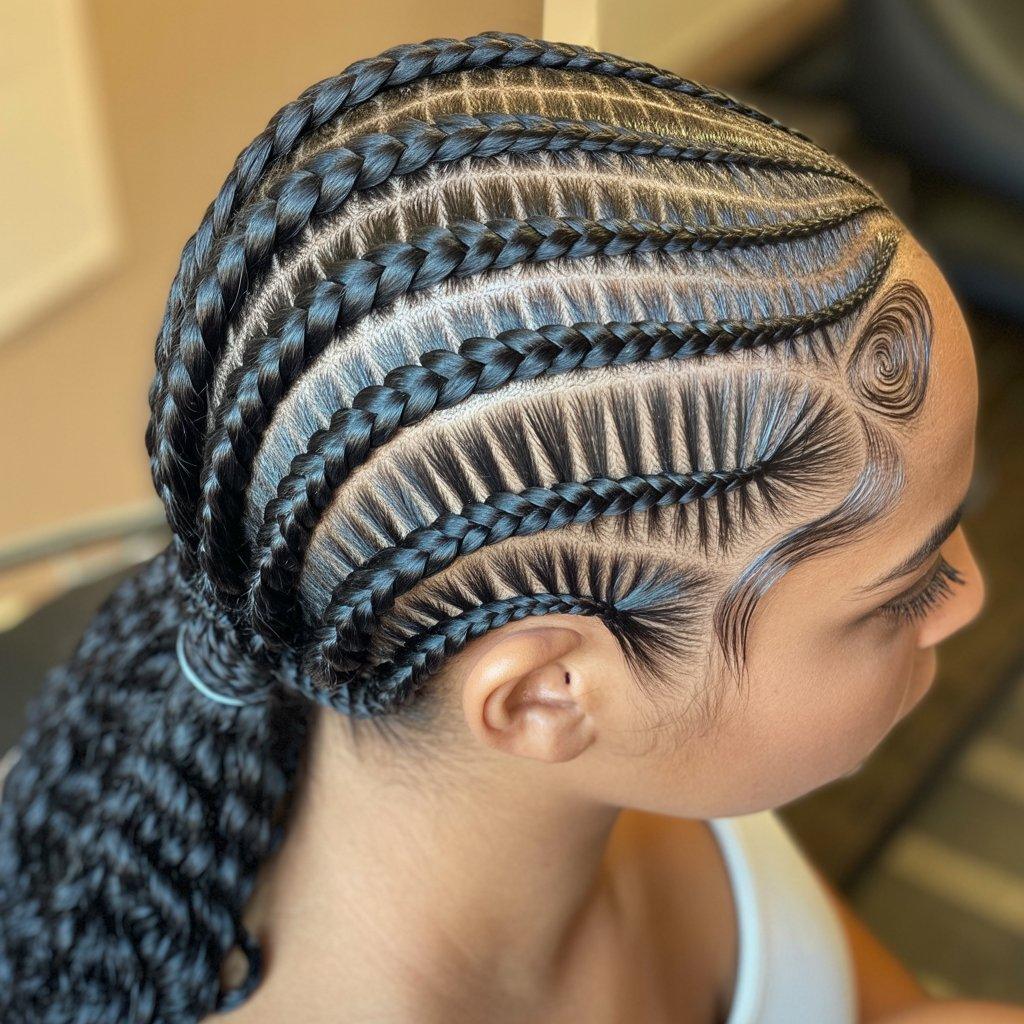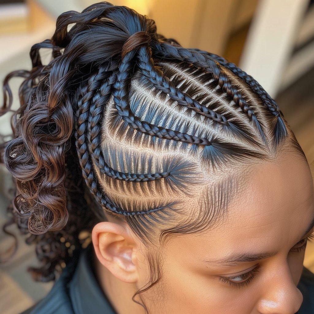 I love doing cornrows with patterns because you can make them really personal. Straight-back cornrows are simple, but once you start adding curves, zig-zags, or even small geometric designs, it turns into something special. I usually combine them with a ponytail or curly ends for a little flair.