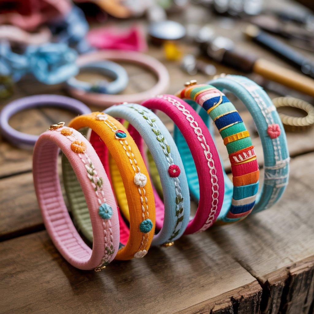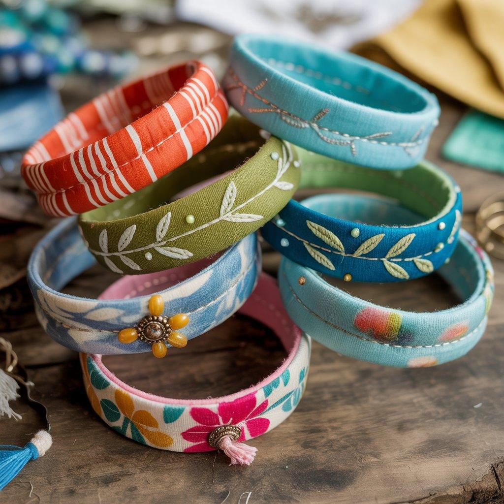 I usually start by wrapping fabric strips around a lightweight base, like old wooden bangles, cardboard rings, or plastic hoops. Then I secure them with strong stitching or fabric glue, adding decorative touches like embroidery, beads, or small charms. Each bangle comes out unique, which is part of the appeal.
