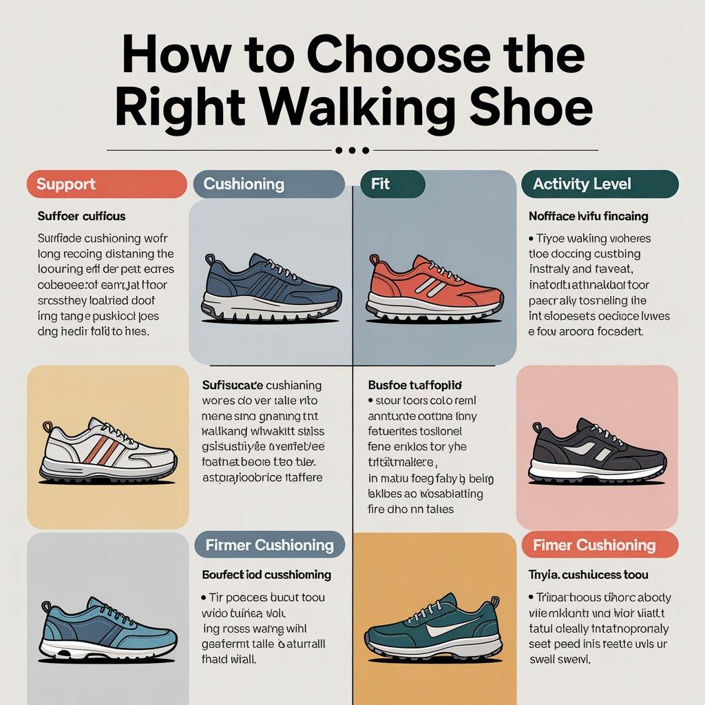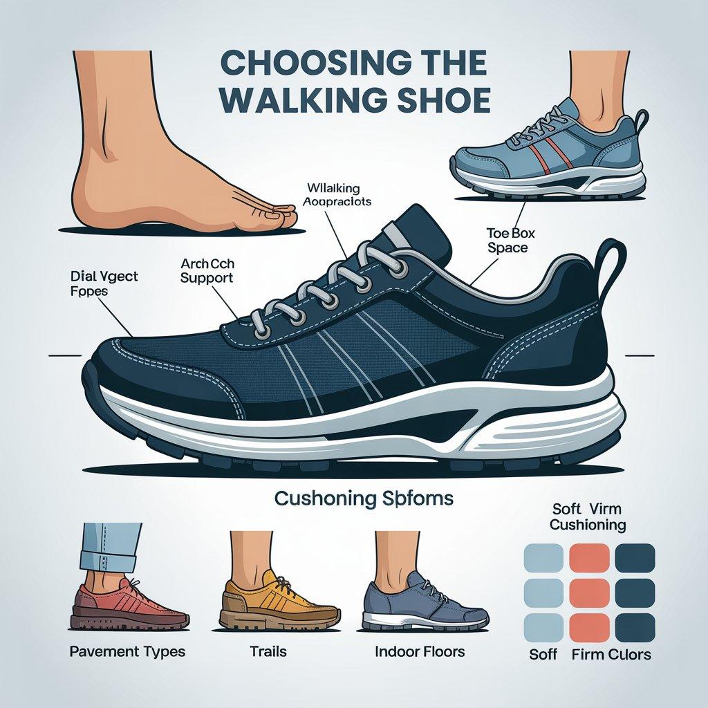When it comes to choose walking shoes, focus on four main things: support, cushioning, fit, and activity level. Softer cushioning works well for long distances, while firmer cushioning offers better stability. Make sure your toes have room, especially if you walk for extended periods.
