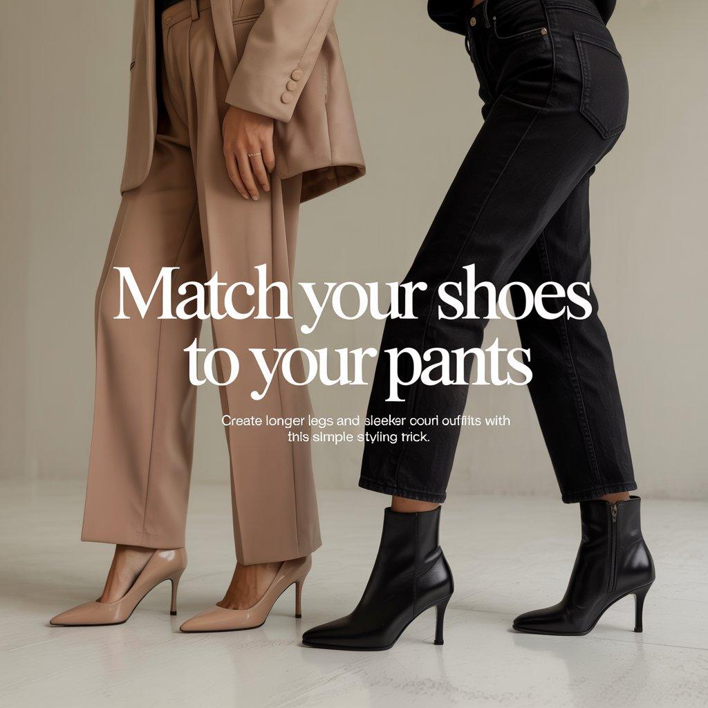 One visual trick that makes legs look longer and outfits look sleeker is matching your shoes to your pants. When you wear nude heels with nude trousers, or black boots with black jeans, the line isn’t broken, and the whole outfit looks more streamlined.