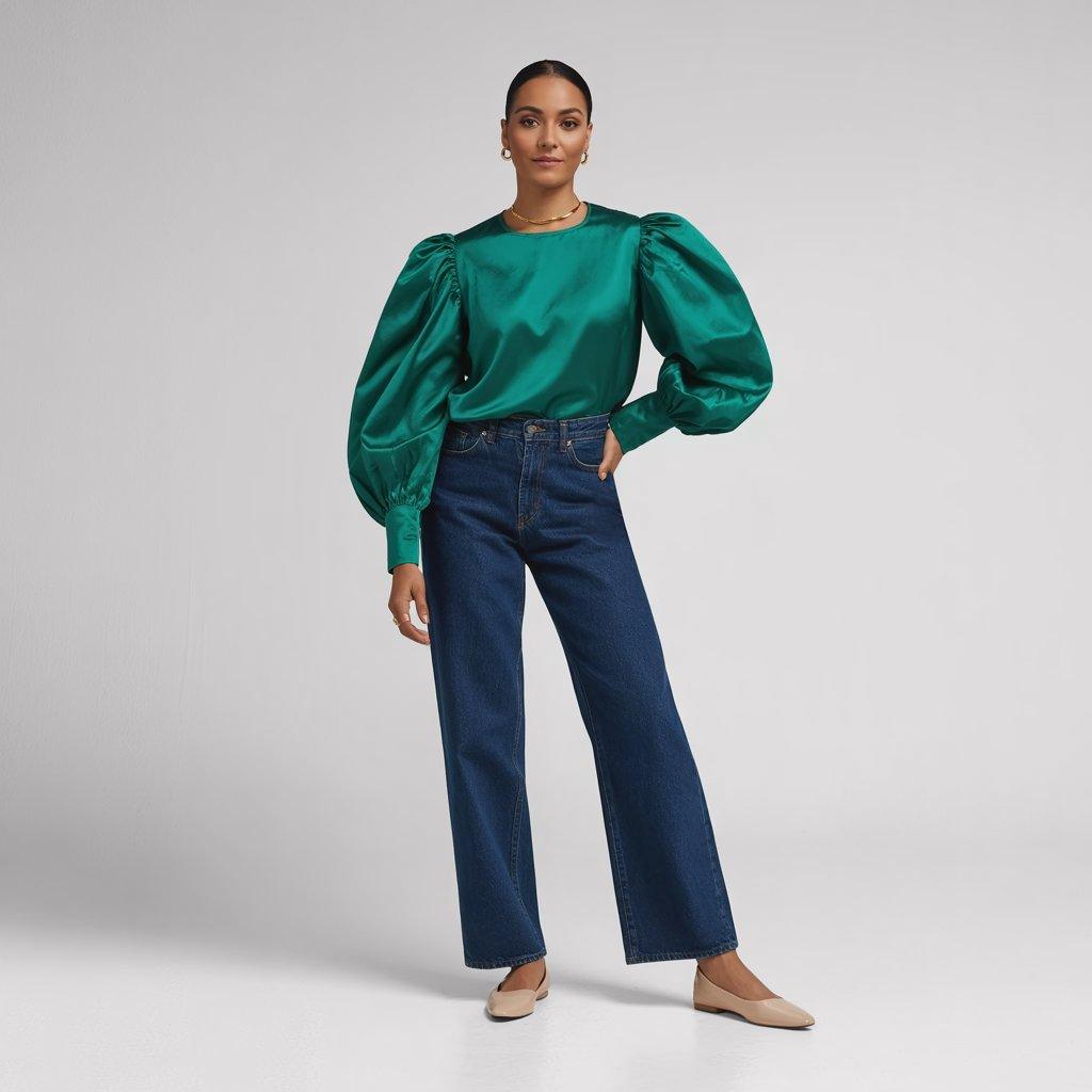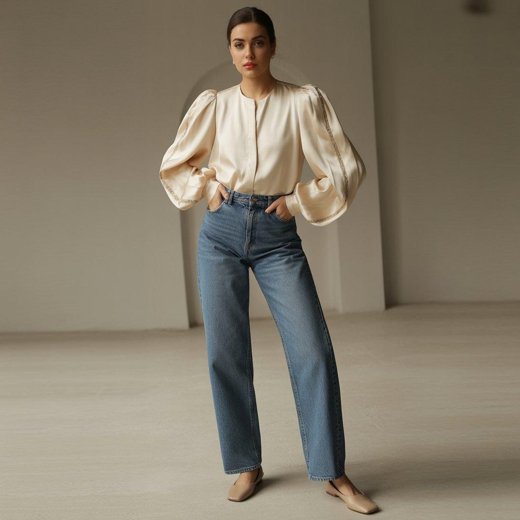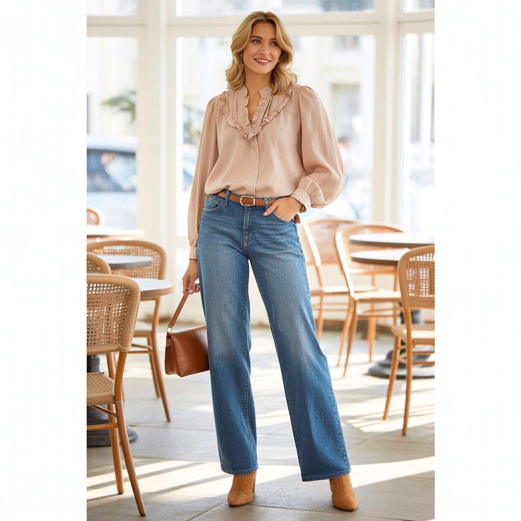 Start with straight or slightly loose jeans. Add a blouse with detail at the sleeves or neckline. Tuck it in or do a half-tuck for shape. Finish with ankle boots or strappy flats.