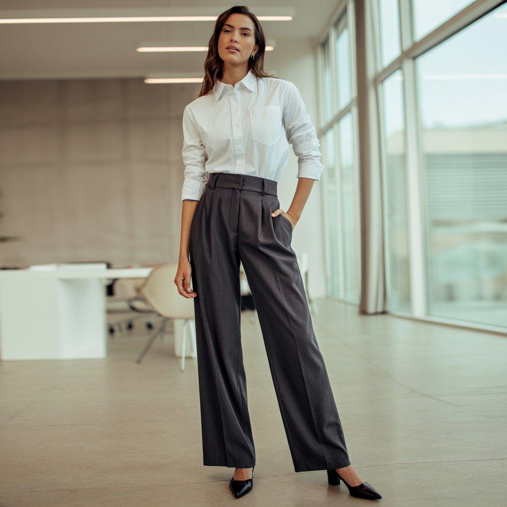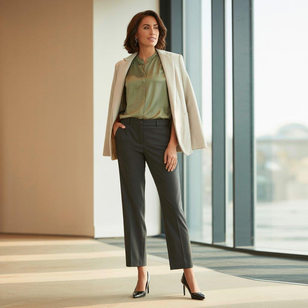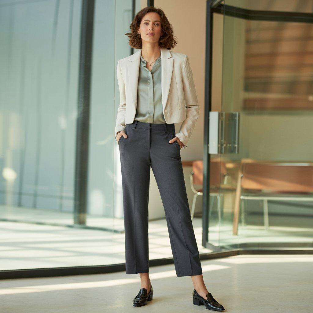 If you want to update it for this season, choose trousers with a slightly wider leg or a subtle pleat. Small updates like this keep your work wardrobe current without needing to replace everything.