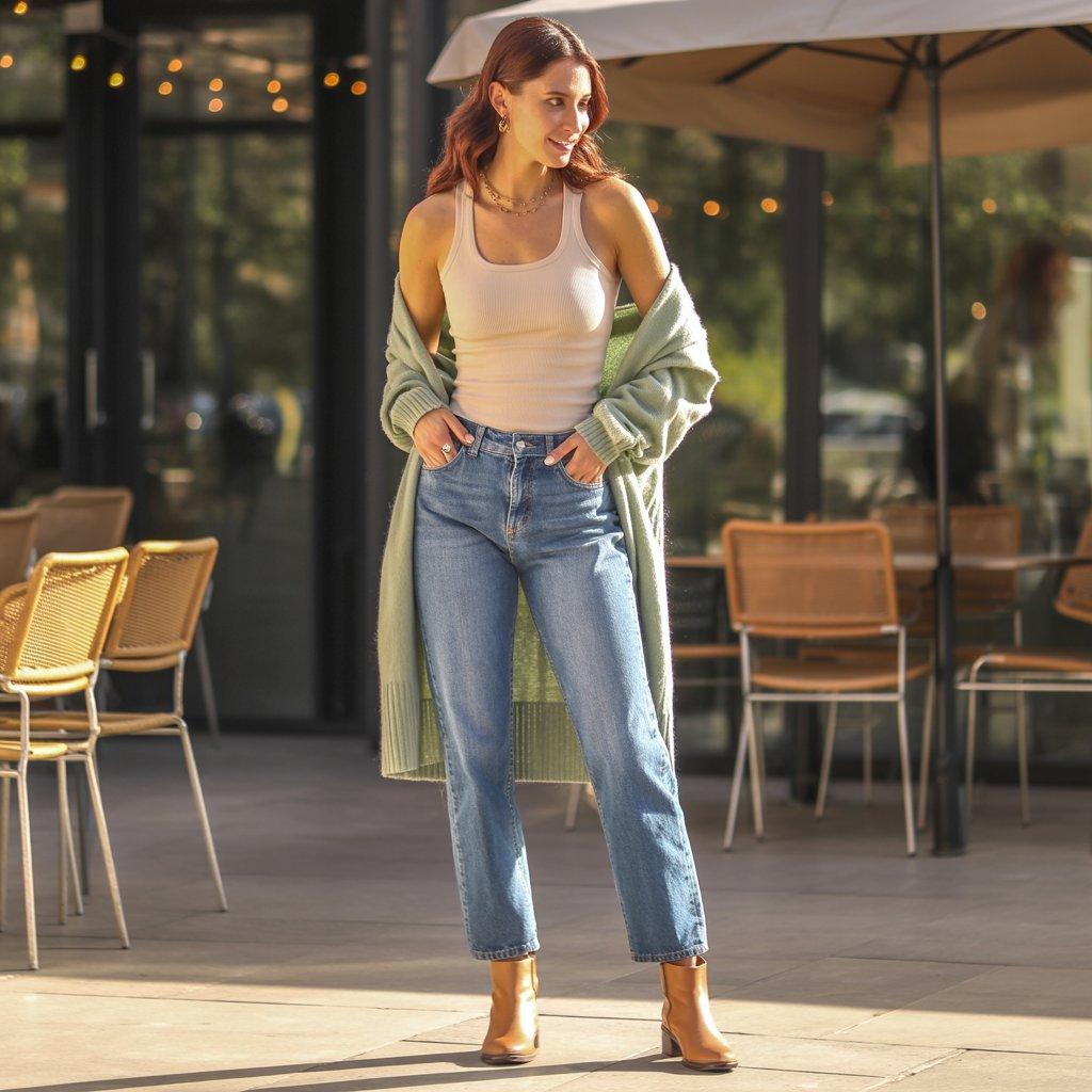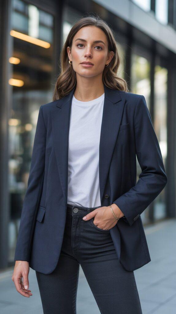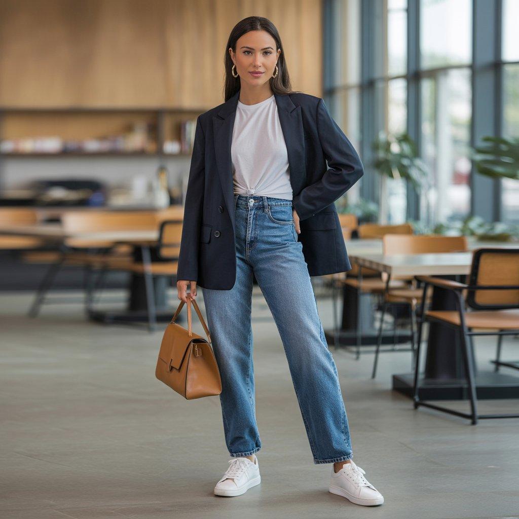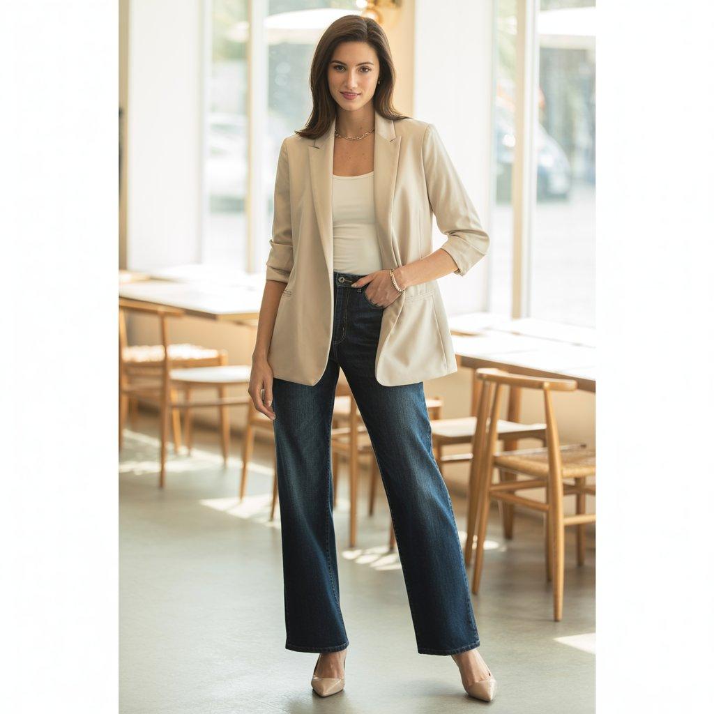 Some days I don’t want full workwear, but I still want structure. That’s when I reach for a relaxed blazer and jeans. I usually go with straight-leg or slightly wide-leg denim in a clean wash. Then I add a fitted tank or simple blouse underneath.