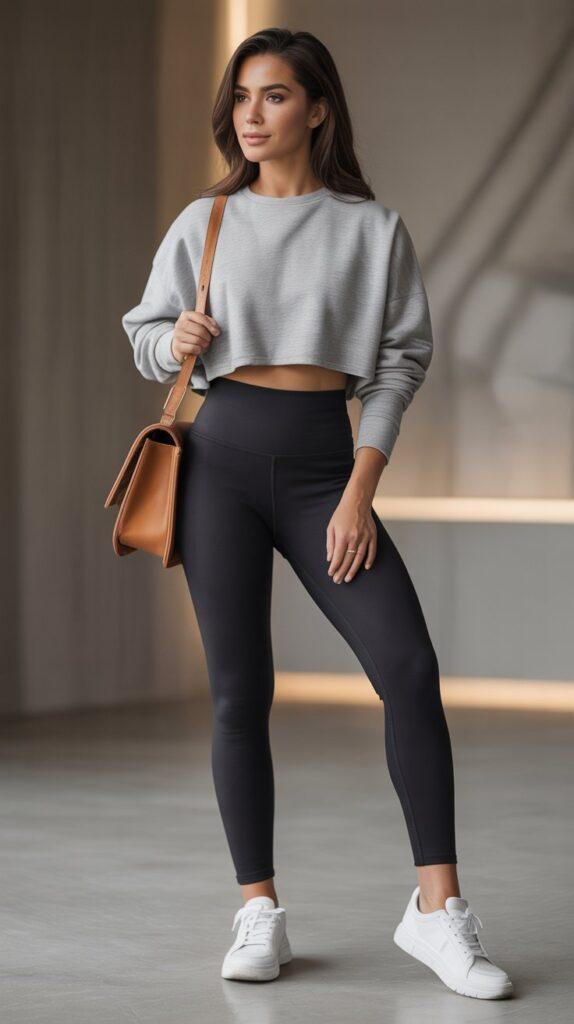 Athleisure is everywhere, but the trick is keeping it neat. I like starting with high-quality leggings in black, deep brown, or charcoal. Pair them with an oversized but structured sweatshirt or a fitted long-sleeve top. The balance matters. If the bottom is tight, keep the top slightly loose.