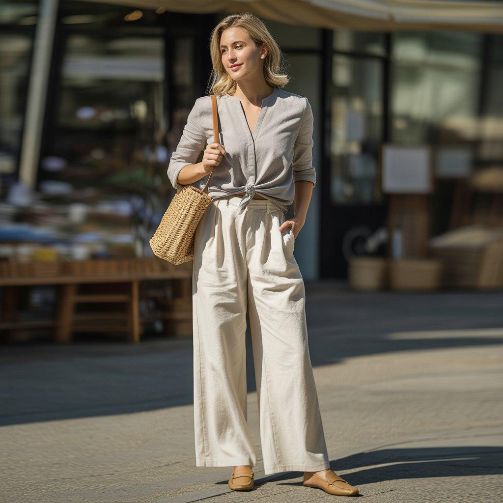 Try wide-leg linen trousers with a relaxed cotton blouse. Tuck the front slightly to shape your waist. Add flat sandals or simple loafers. If you prefer something more fitted, swap the blouse for a ribbed tank and add a lightweight cardigan.