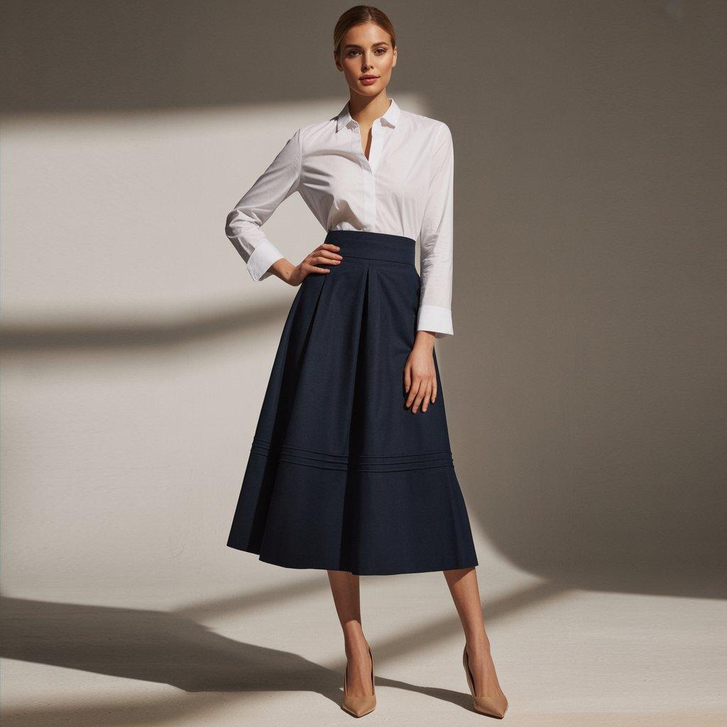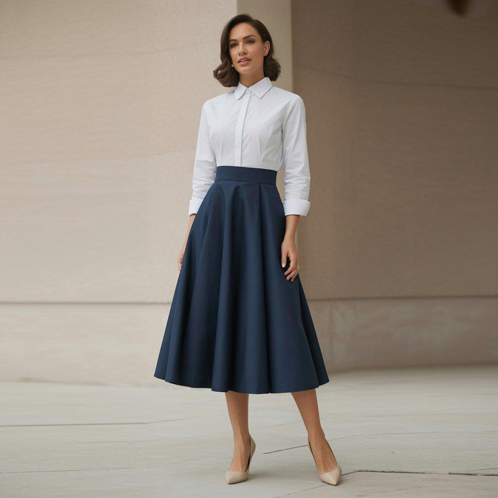 When I want something a little more dressed up, I go for a structured midi skirt. A-line or pleated styles work well because they move nicely when you walk.
