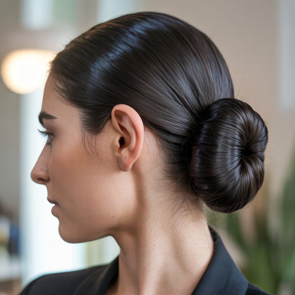 A polished low bun continues to trend because it’s both practical and elegant. Smooth your hair with a little serum, gather it at the nape of your neck, and secure it with a band or pins.