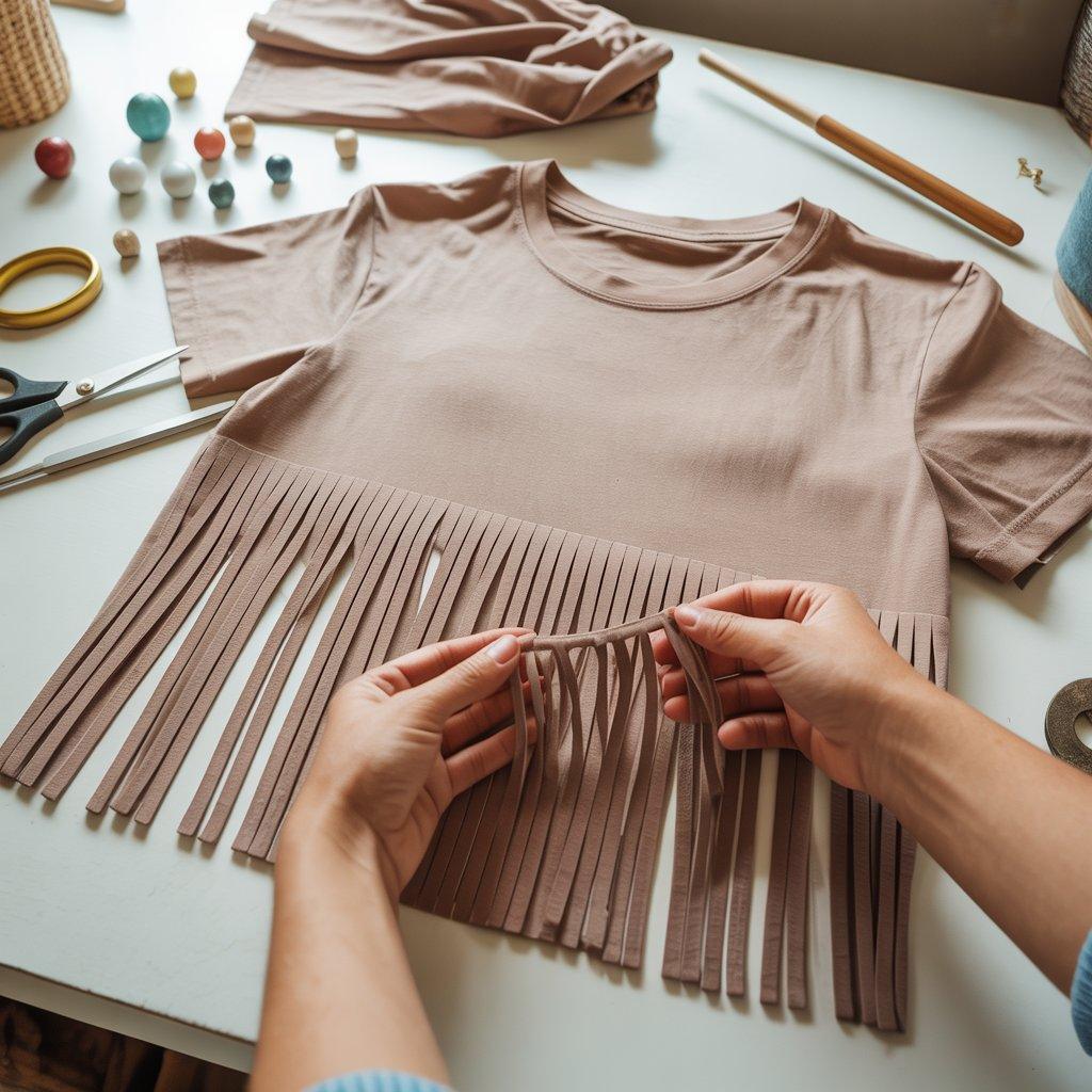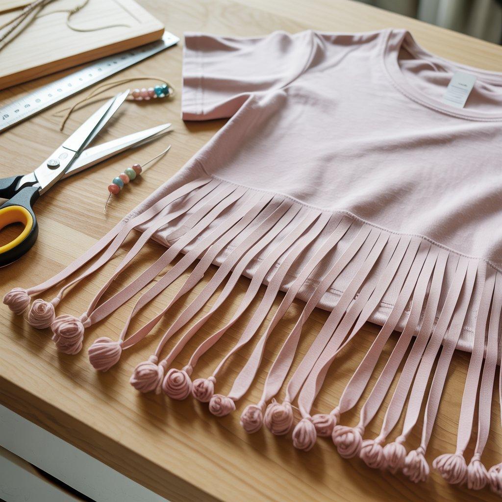 Stop about four inches from the collar. Once all the cuts are made, gently stretch each strip. The fabric will curl into soft, noodle-like fringe. For extra style, tie small knots at the ends of each fringe strip.