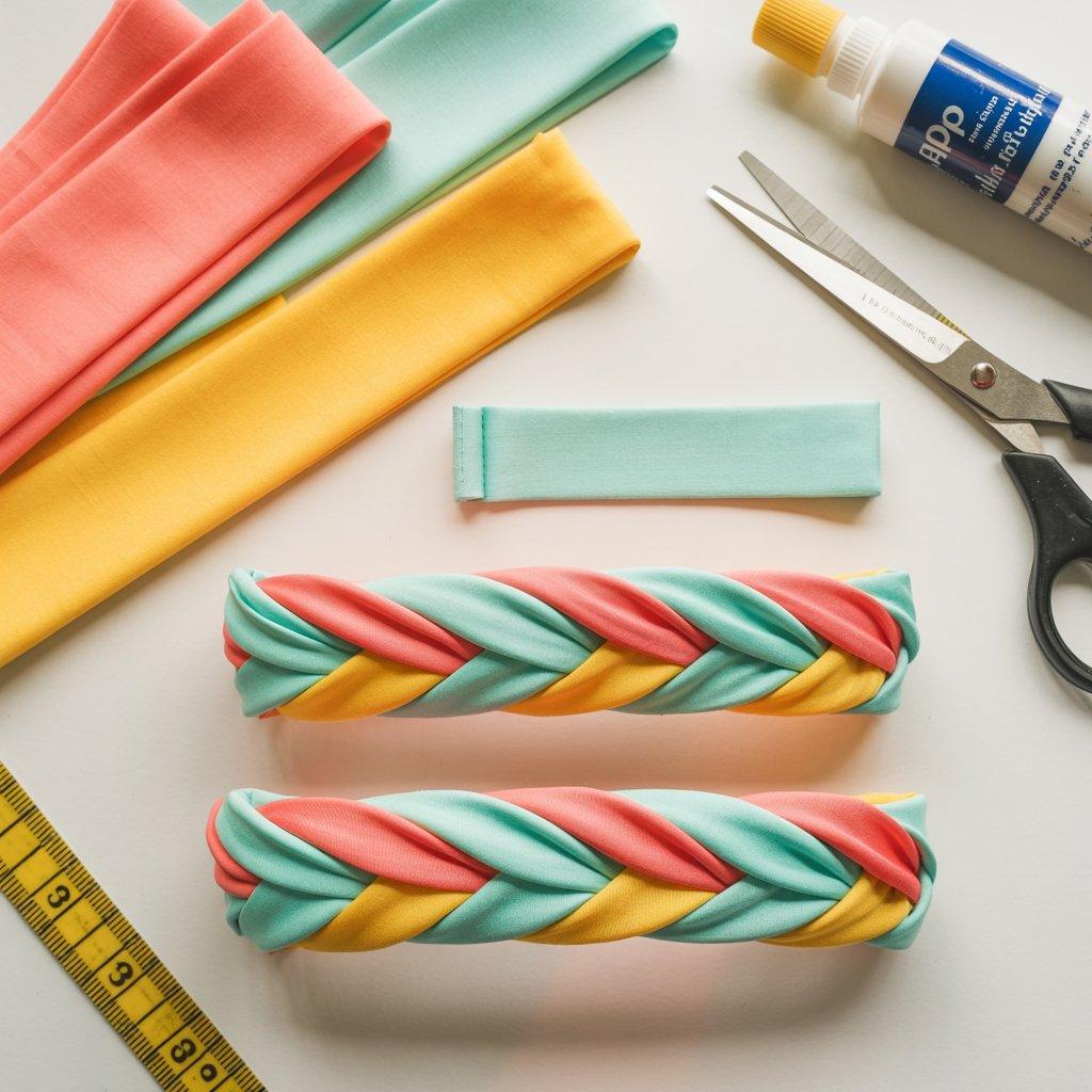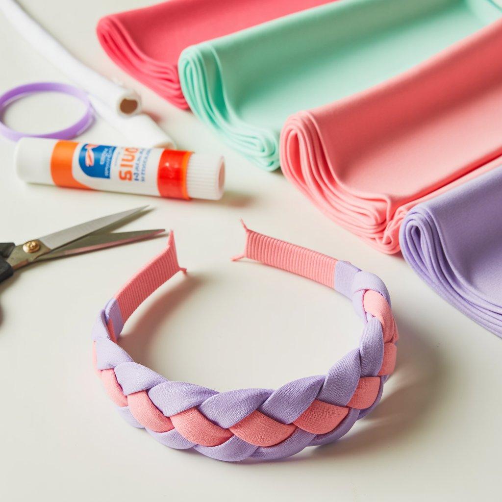 Cut three strands of fabric in different colors. Tie a knot at one end, braid them tightly, then knot the other end. Glue the knots to keep them from unraveling. Wear it to keep hair off your face on hot days.