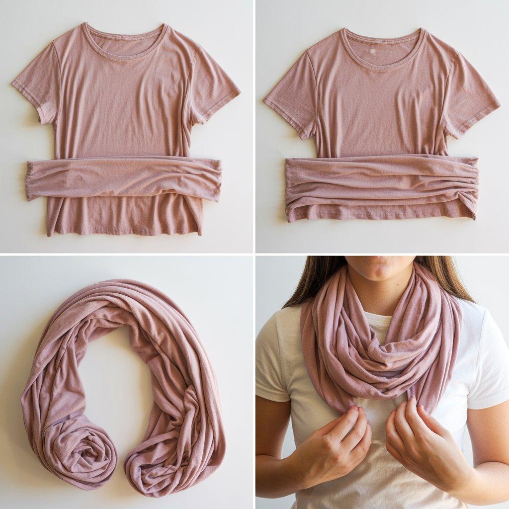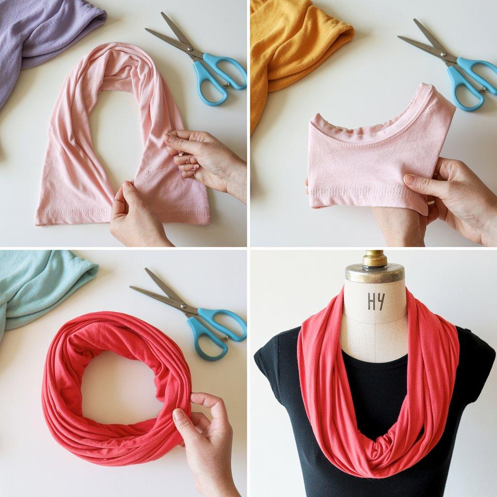 An infinity scarf is basically a loop of fabric you can wear a dozen different ways. To make one, grab an old t-shirt preferably a larger size. Cut straight across just below the armpits and just above the bottom hem.