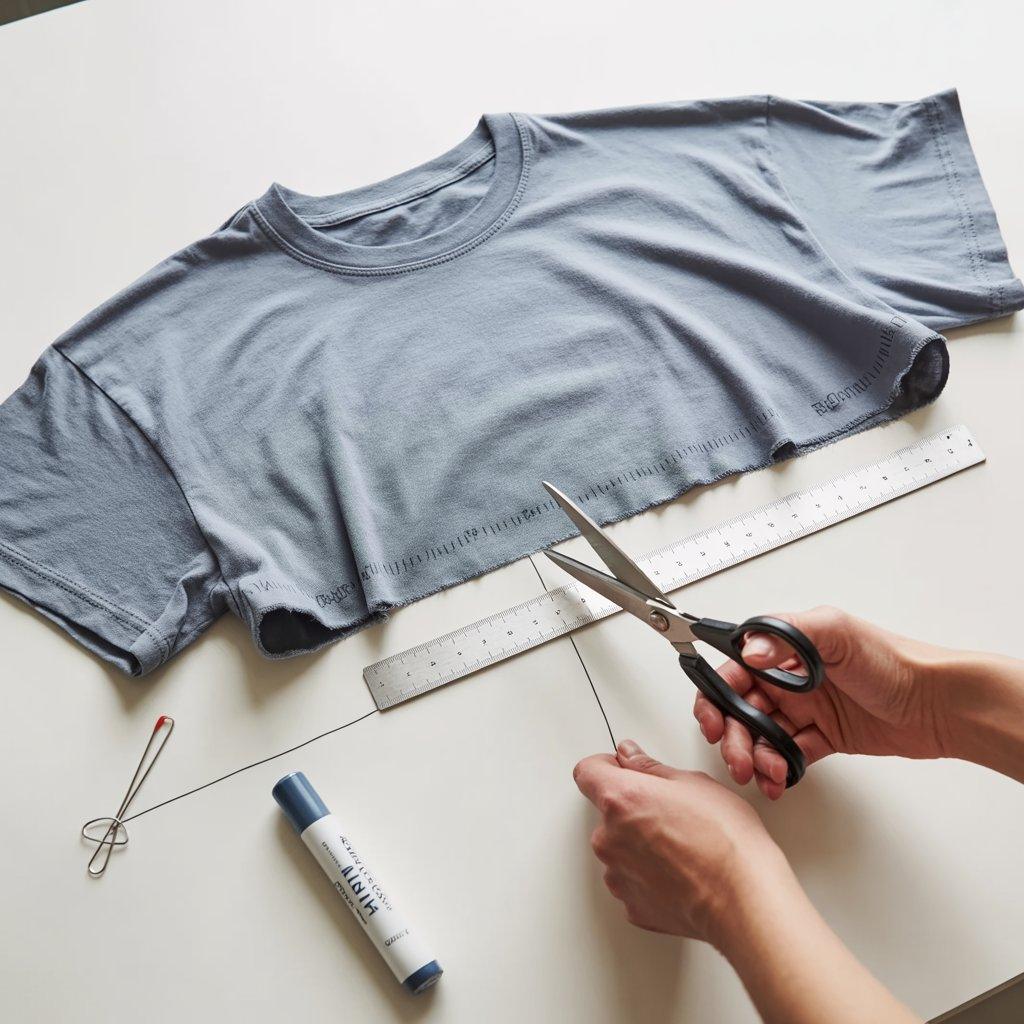 You don’t need to be a fashion designer to make a crop top. Put on an oversized t-shirt and decide how short you want it. Mark that spot with a pin or washable marker. Take the shirt off and lay it flat.