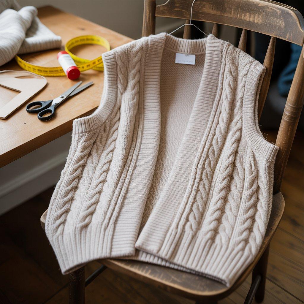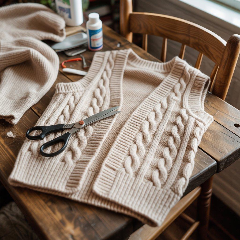 Got a sweater that’s too snug or stretched out? Turn it into a vest. Lay the sweater flat. Cut straight up from the bottom hem to the underarm on both sides. Then cut across from the underarm to the collar, removing the sleeves.