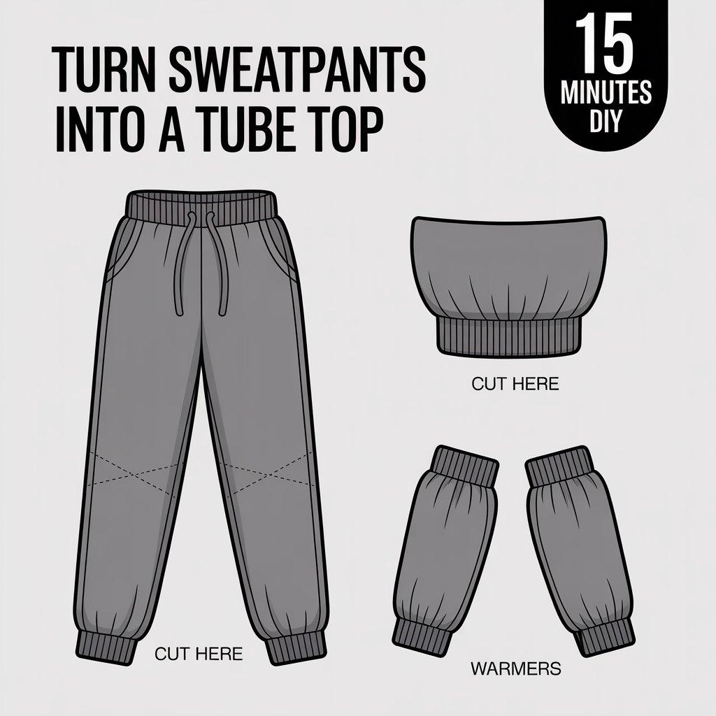 Old sweatpants can become a trendy tube top in about fifteen minutes. Lay the sweatpants flat. Cut straight across the legs just below the crotch seam. The top part the waistband section becomes your tube top.