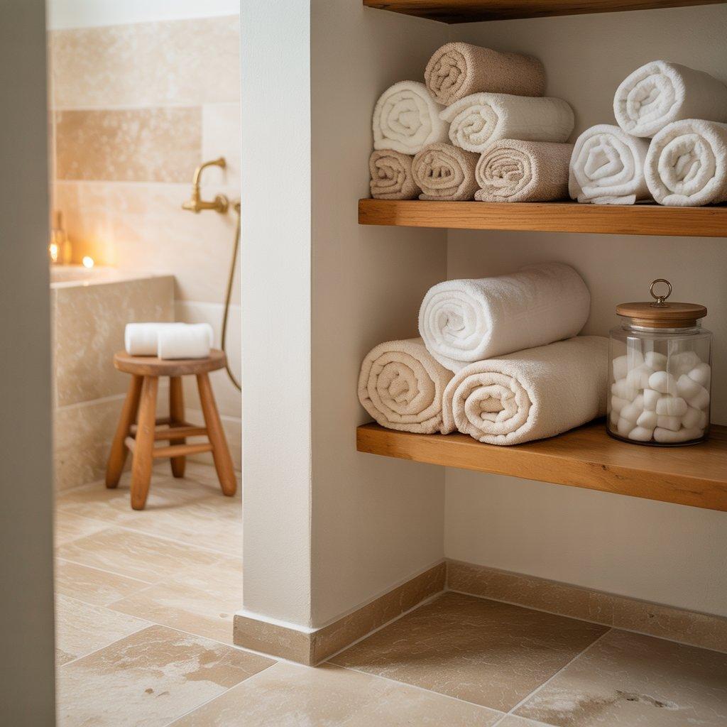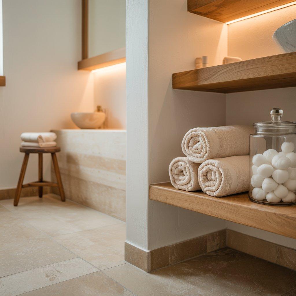 I prefer wood shelves with simple brackets or hidden supports. Add baskets or folded towels for a clean look. Open storage can feel organized if you keep it minimal. This approach refreshes your bathroom by making it feel lighter and more functional at the same time.