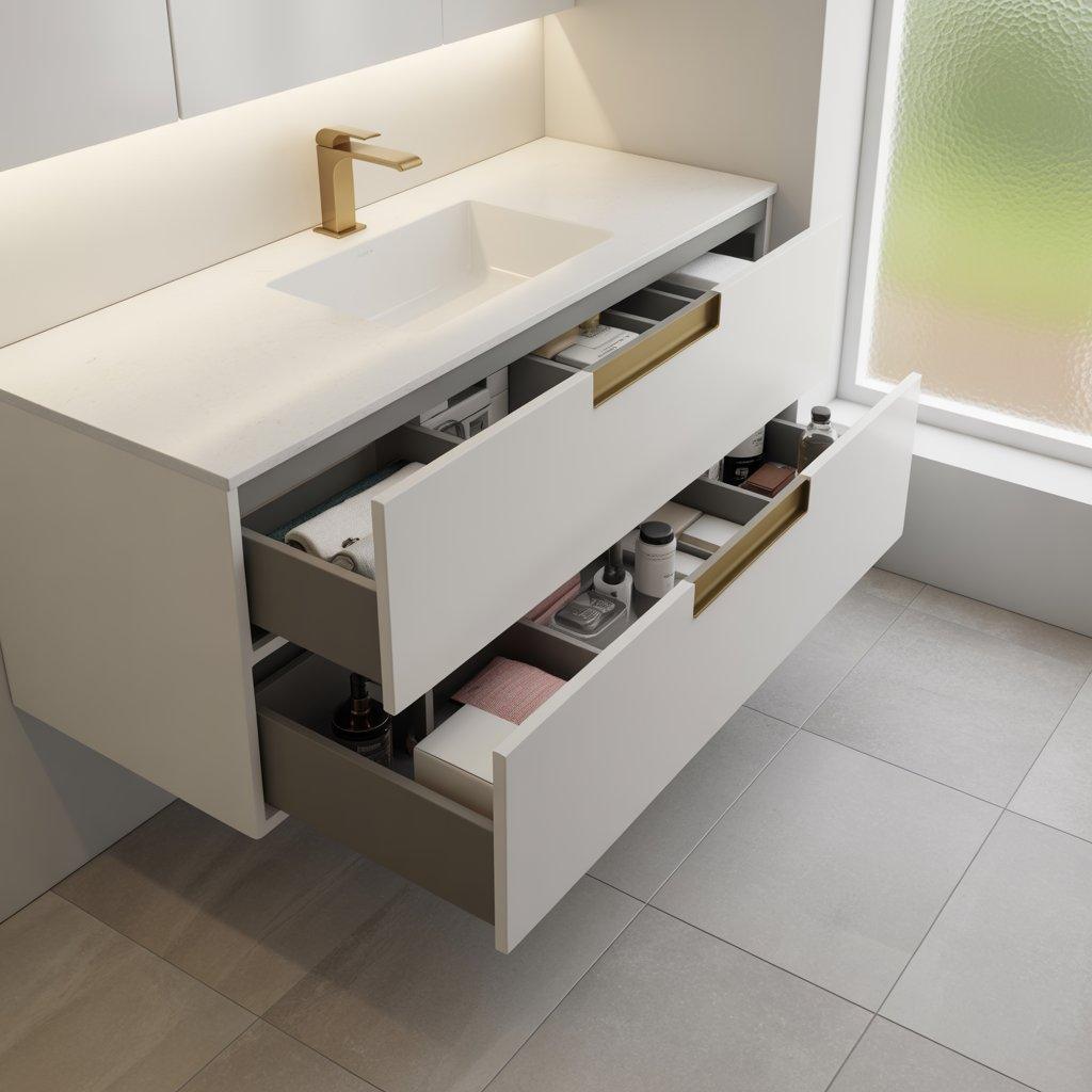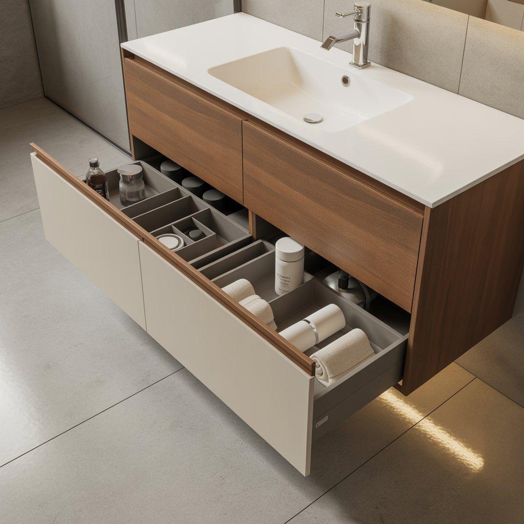 Wall-mounted vanities create extra floor visibility, which makes the bathroom feel lighter. I like this design especially in small spaces. It gives the illusion of more room while still offering storage underneath. Cleaning is easier too since you can sweep or mop beneath it.