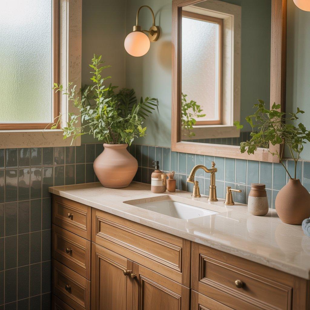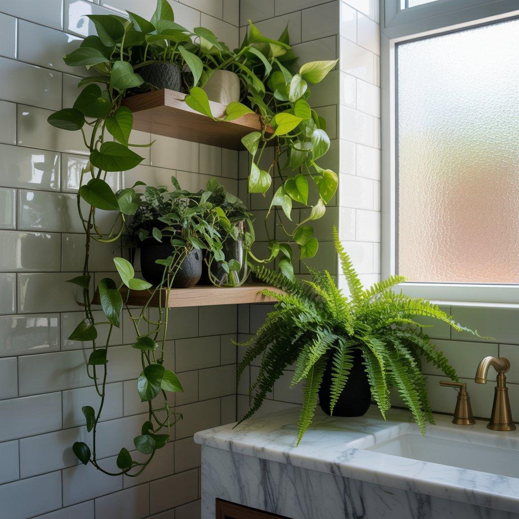 Adding plants is something I almost always recommend. Bathrooms with good light can support plants like pothos or ferns. Even a small plant on a shelf or vanity adds life to the space. If natural light is limited, realistic artificial greenery still softens the room.