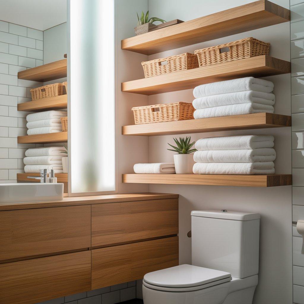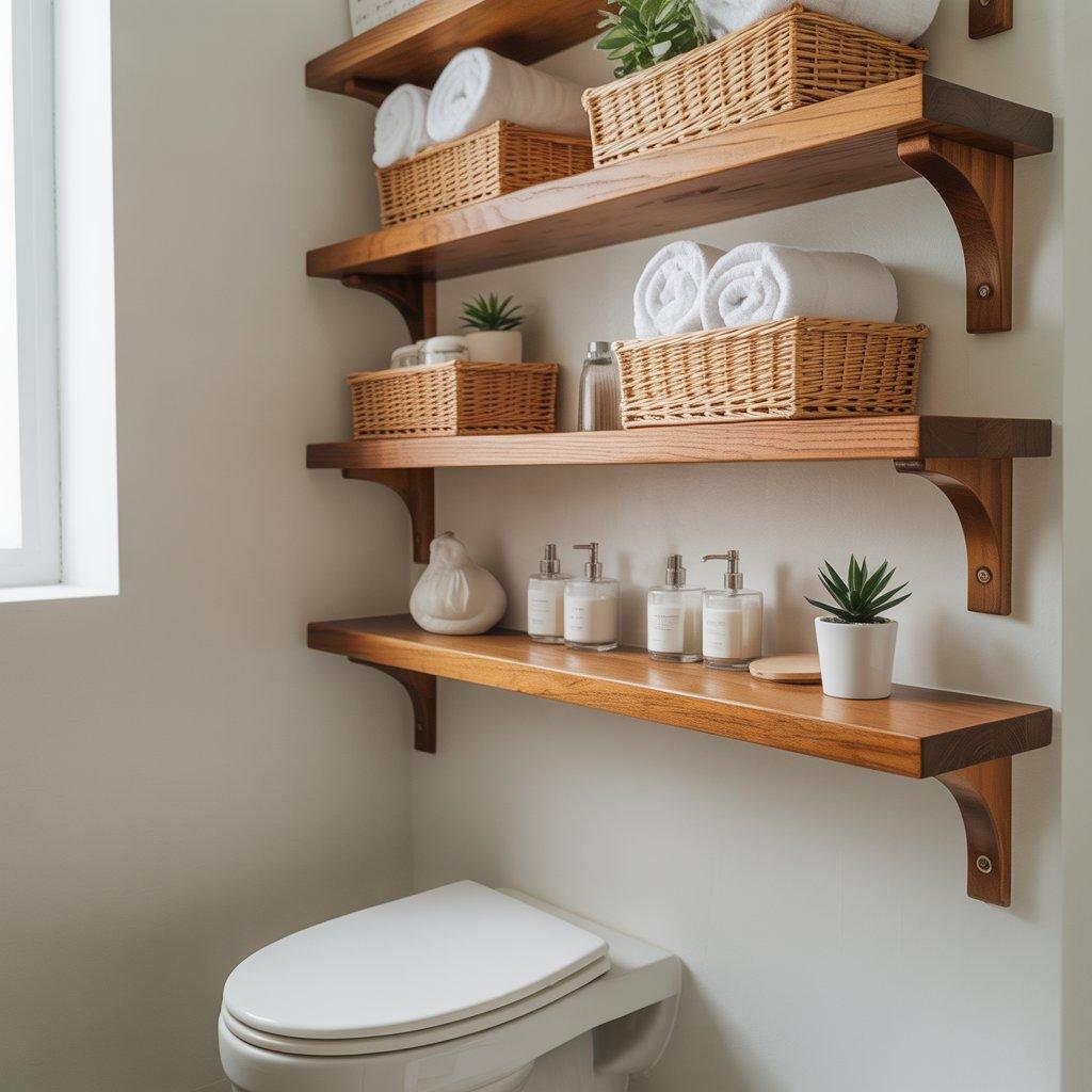 When storage feels tight, I often install floating shelves above the toilet or beside the vanity. They keep everyday items within reach without crowding the floor.