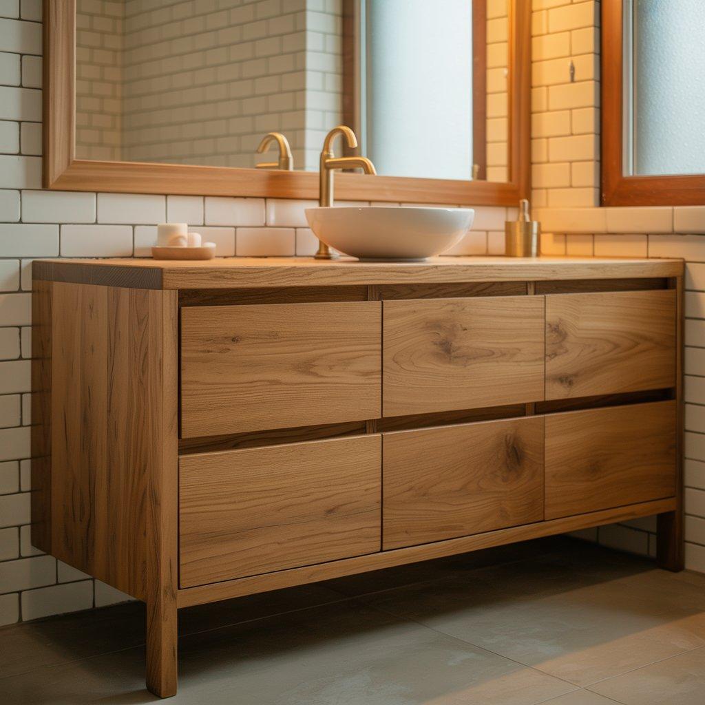 One of the simplest ways I’ve refreshed a bathroom is by replacing a plain cabinet with a natural wood vanity. Wood instantly softens a space that might otherwise feel cold because of tile and porcelain. You don’t need rare materials. Even a simple oak or bamboo vanity can add warmth.