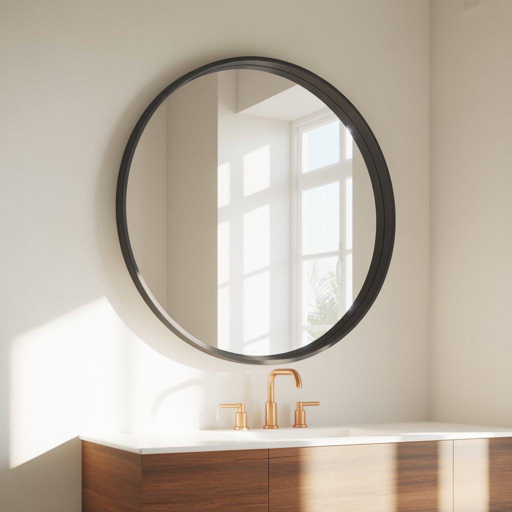 A basic rectangular mirror works fine, but replacing it with a round or framed mirror changes the mood immediately. I’ve used black metal frames, wooden frames, and even thin brass finishes. The mirror becomes a focal point instead of just a necessity.
