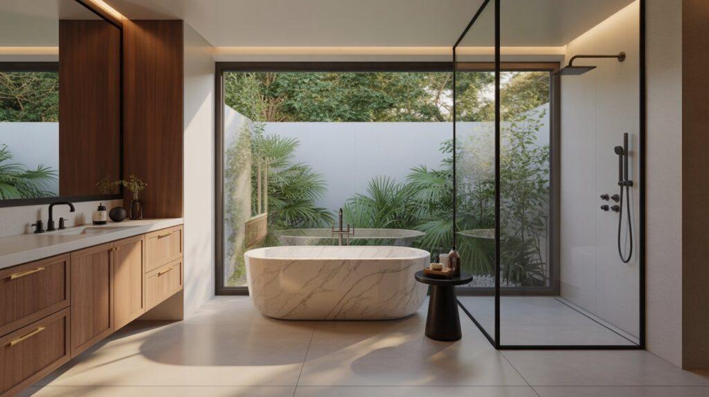 I like sealed or treated wood to handle moisture properly. Pair it with neutral tiles and simple hardware for balance. This bathroom design inspiration works especially well if your space feels too white or sterile. It makes the room feel more grounded and welcoming without overwhelming it.