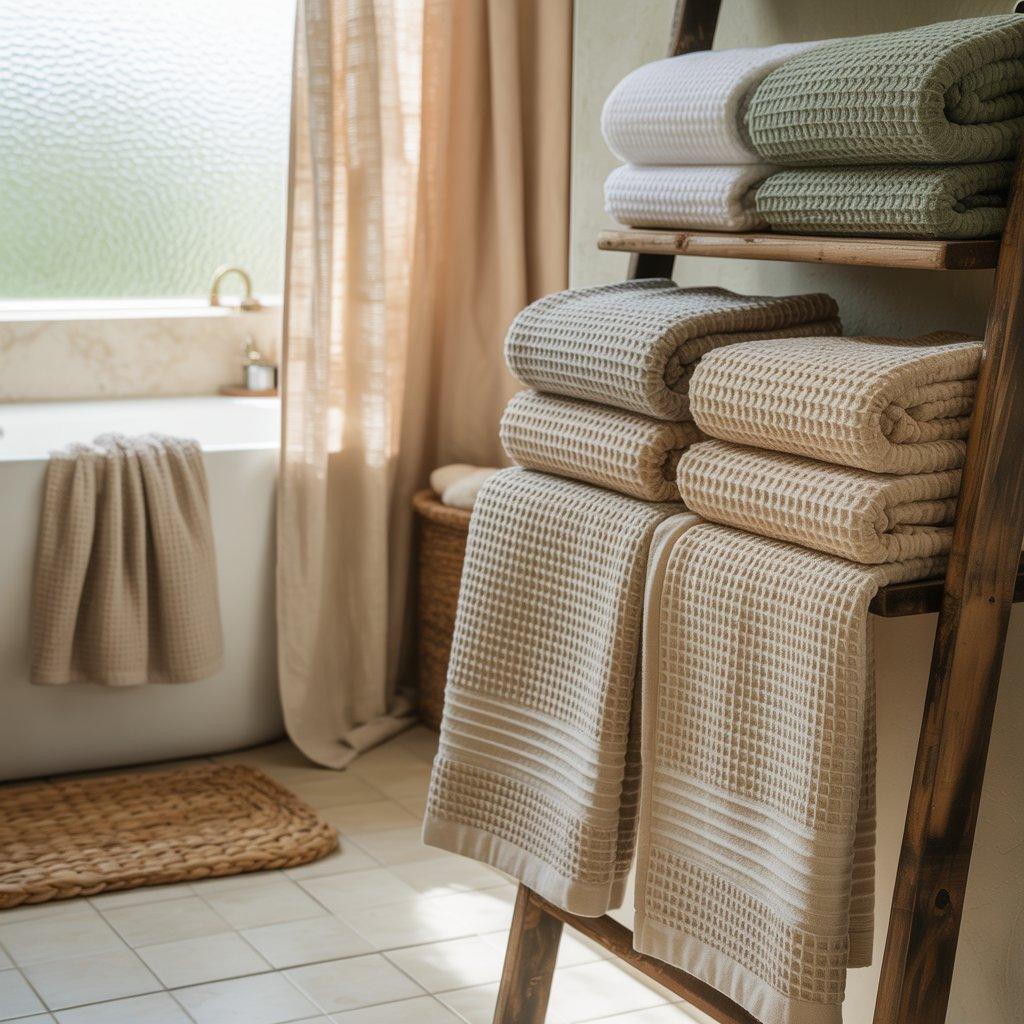 Sometimes refreshing a bathroom doesn’t require construction at all. I’ve updated spaces simply by replacing worn towels with thick, textured ones in coordinated colors. Add a woven bath mat and a simple shower curtain in a natural fabric.