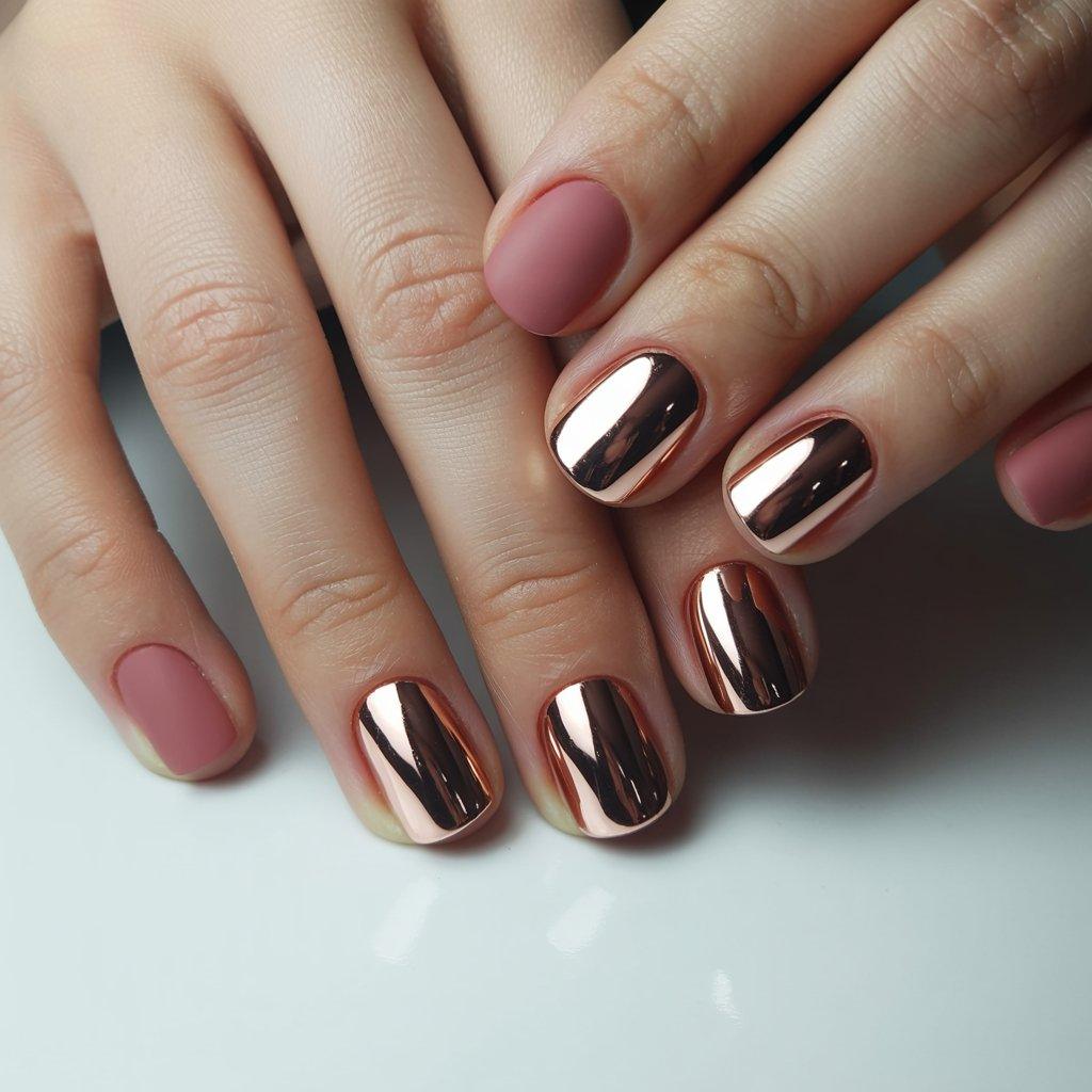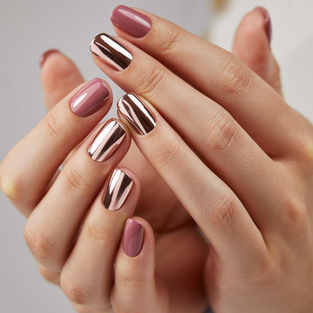 The way people wear chrome has changed too. Full silver chrome on every nail can be a lot. What looks really good is picking one color for most nails and doing chrome on the ring fingers. Say a dusty rose on all nails and rose gold chrome on the accents.