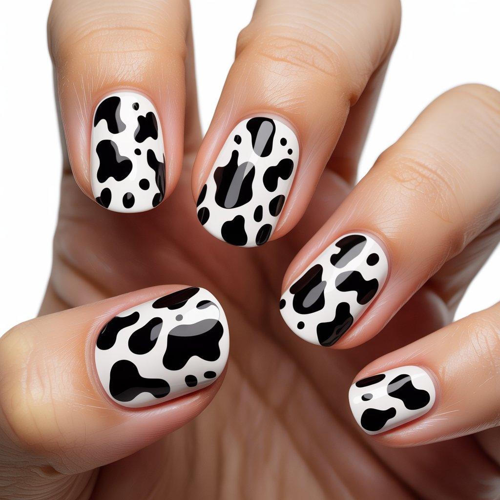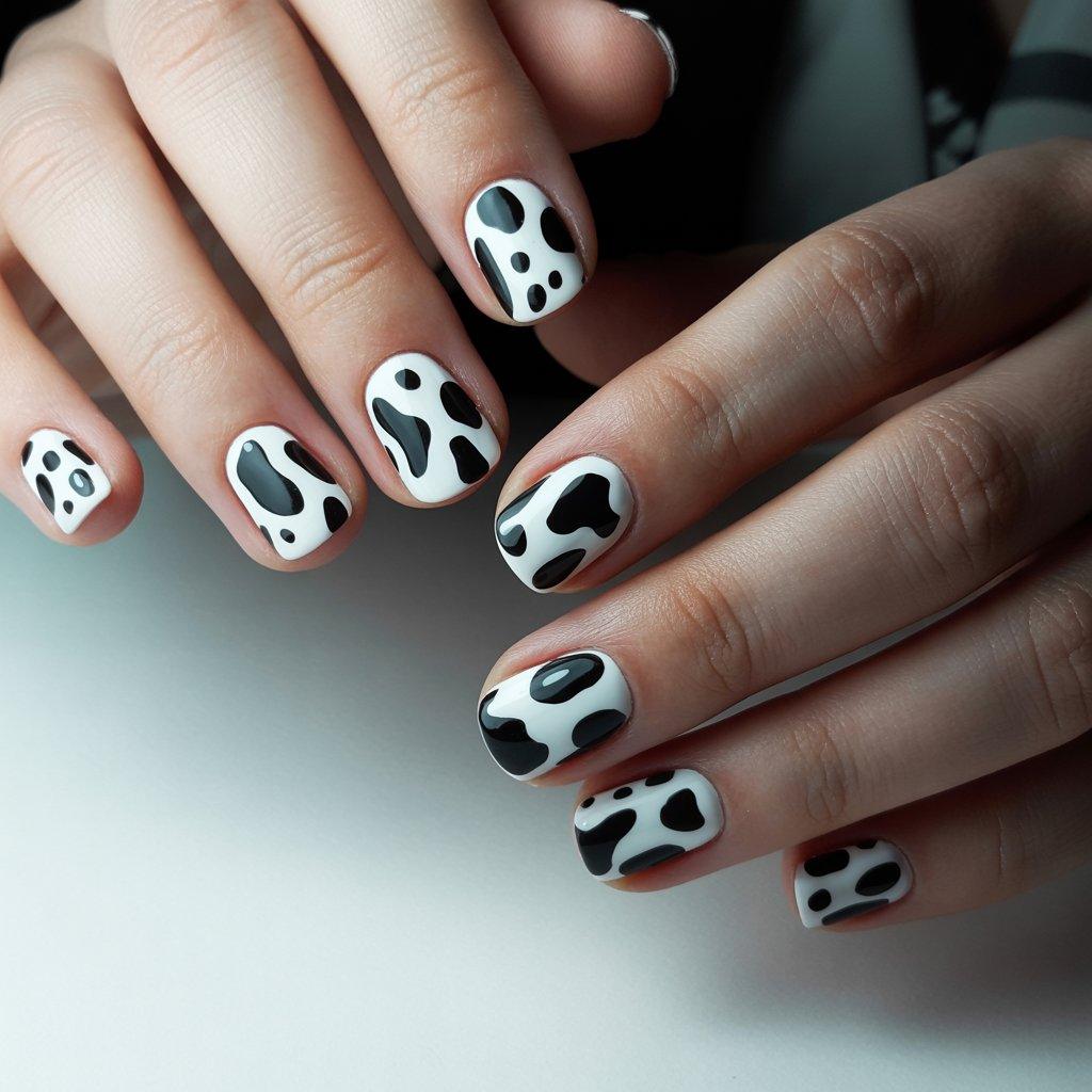 Okay this sounds weird but hear me out. Cow print on nails has been trending for a while and people love it. It’s the black and white splotchy pattern, not actual cows. It’s fun and a little playful but the black and white keeps it from looking too childish. You do a white base and then add irregular black blobs with a few smaller black spots around them. That’s literally it.