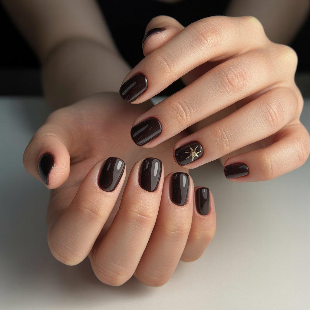 If you want to dress up a dark manicure without going crazy, try a single small detail on one nail per hand. A tiny gold star near the cuticle. One thin stripe down the middle. That’s it. The dark background makes the little detail pop.