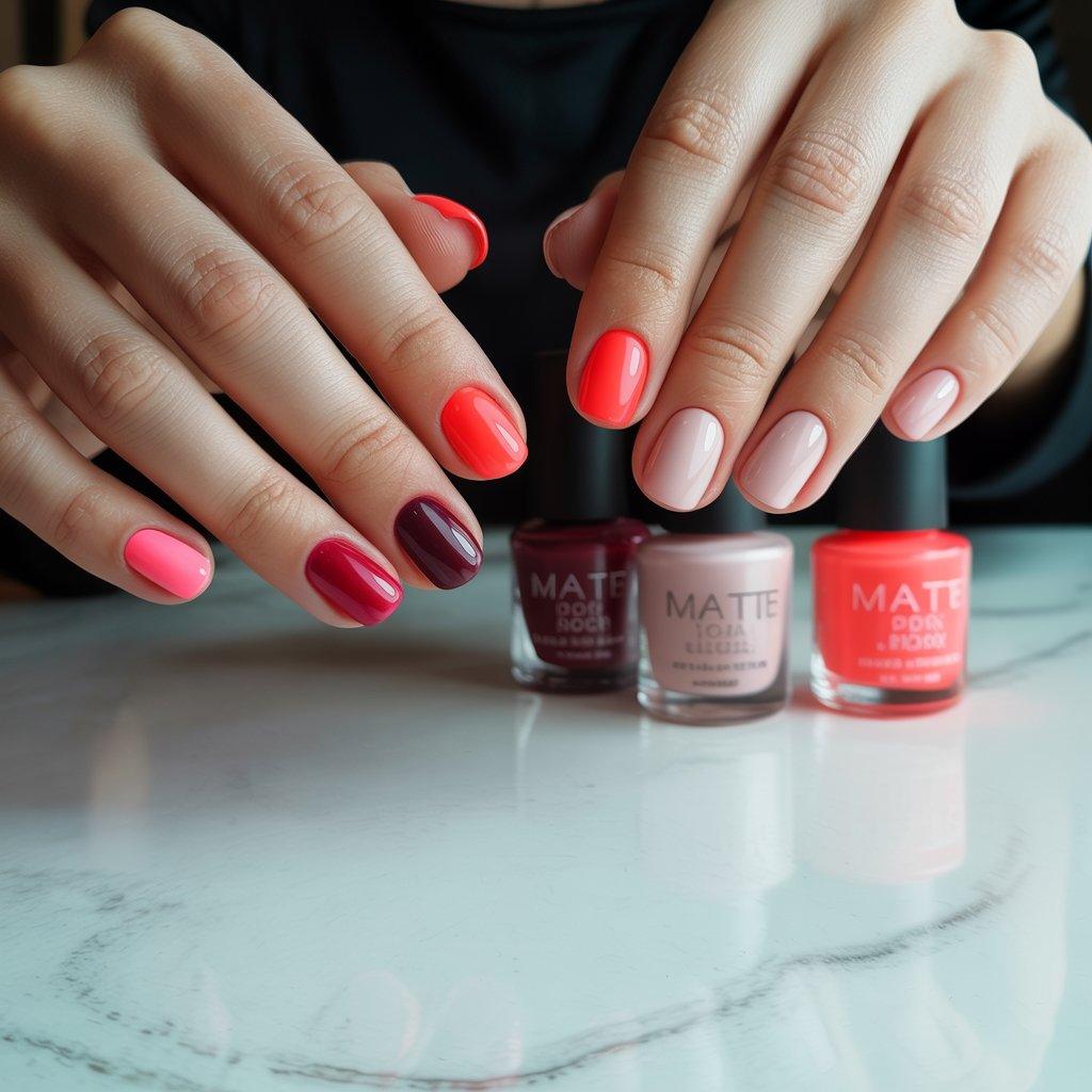 Here’s a trick that changes any design instantly. Matte top coat. Take any shiny nail, any color or pattern, and put a matte top coat over it. Suddenly it looks completely different. A bright pink becomes soft. A dark red becomes velvety. Even a basic nude looks more interesting. It’s the easiest way to upgrade a manicure without learning any new skills.
