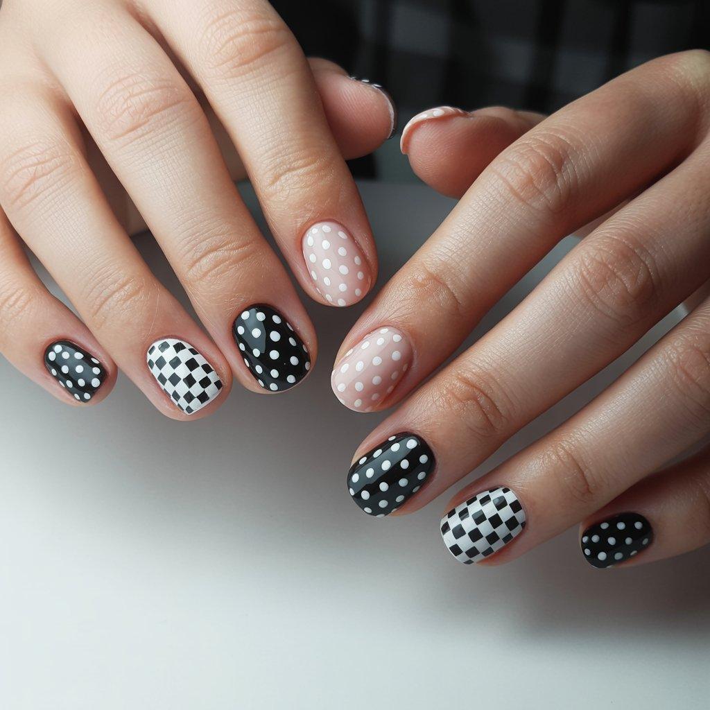 The checkerboard thing is big right now too. It’s just dots arranged in a grid really. You do need a little patience for that one because you want the dots lined up. But it’s not hard, just takes a minute. If you don’t want checkerboard on all ten fingers, do it on your thumbs and ring fingers only.