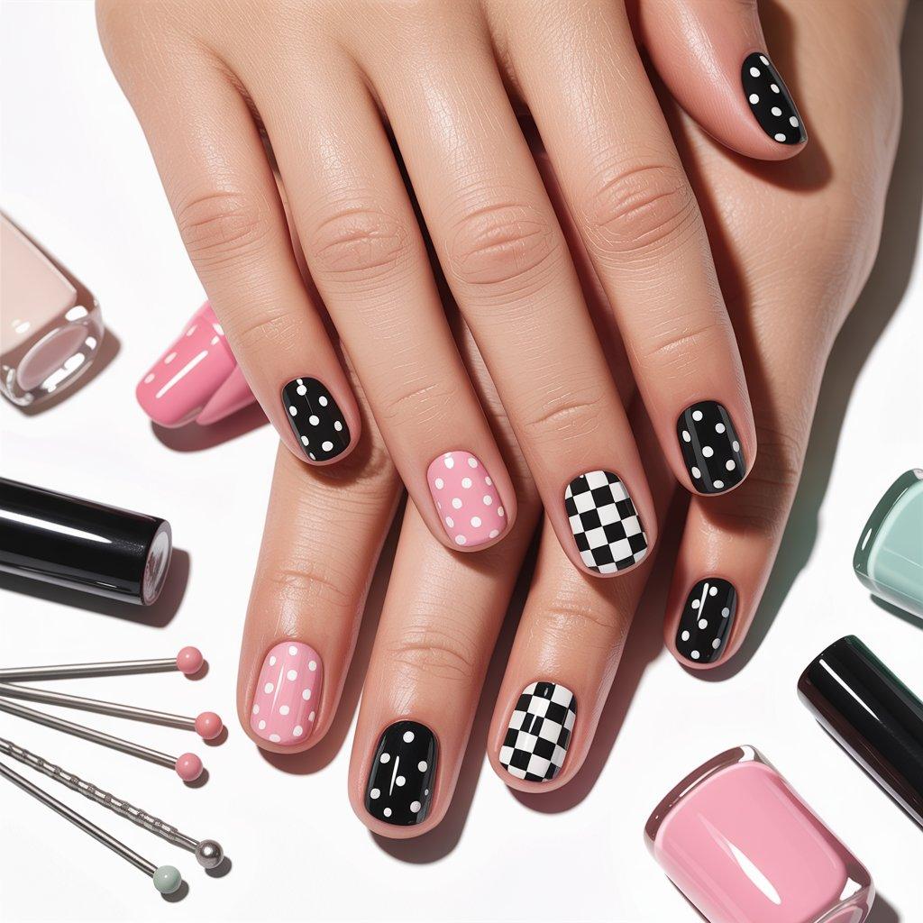 This is the design I tell beginners to start with because you literally cannot mess it up. Grab a bobby pin or the end of a hair clip, dip it in polish, and dot. Big dots, little dots, uneven dots – it all looks intentional and fun. You can do one color on another color. White dots on black looks graphic and cool. Pink dots on nude looks soft and sweet.