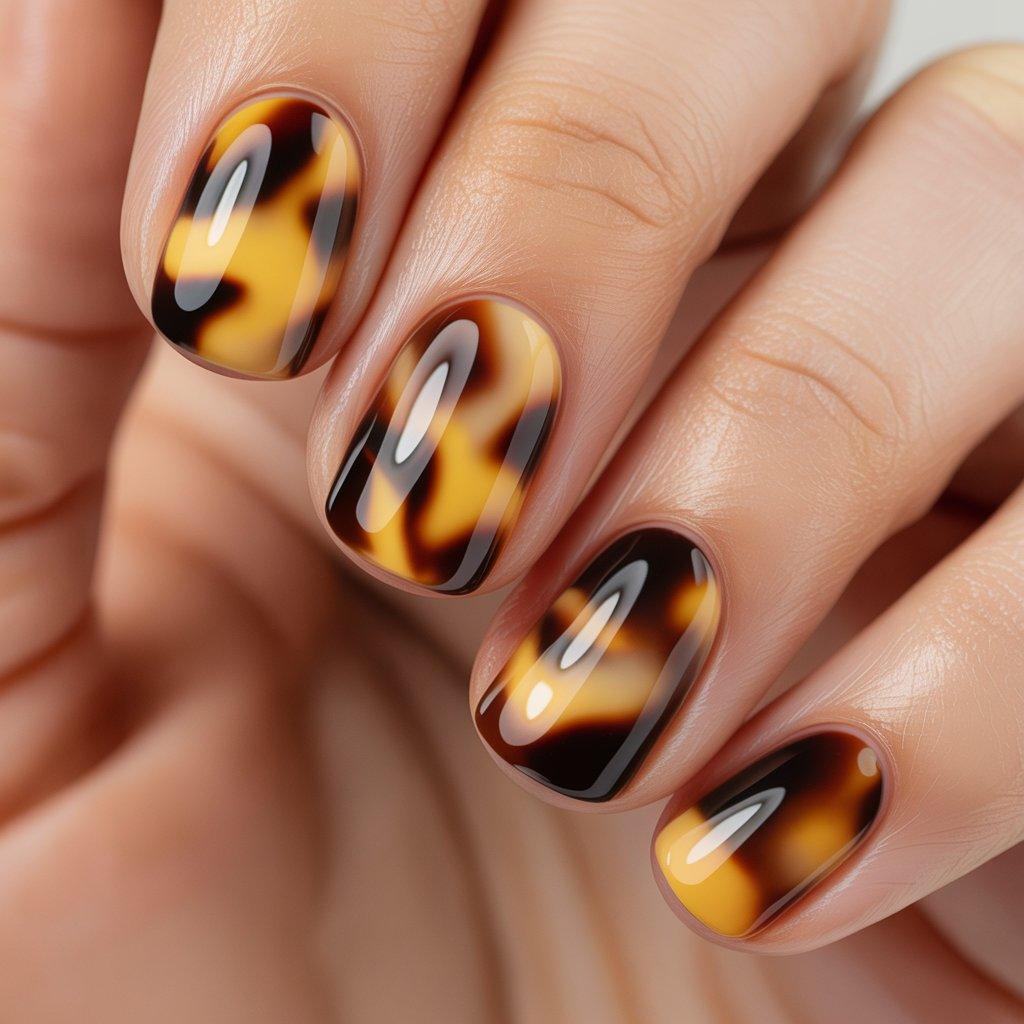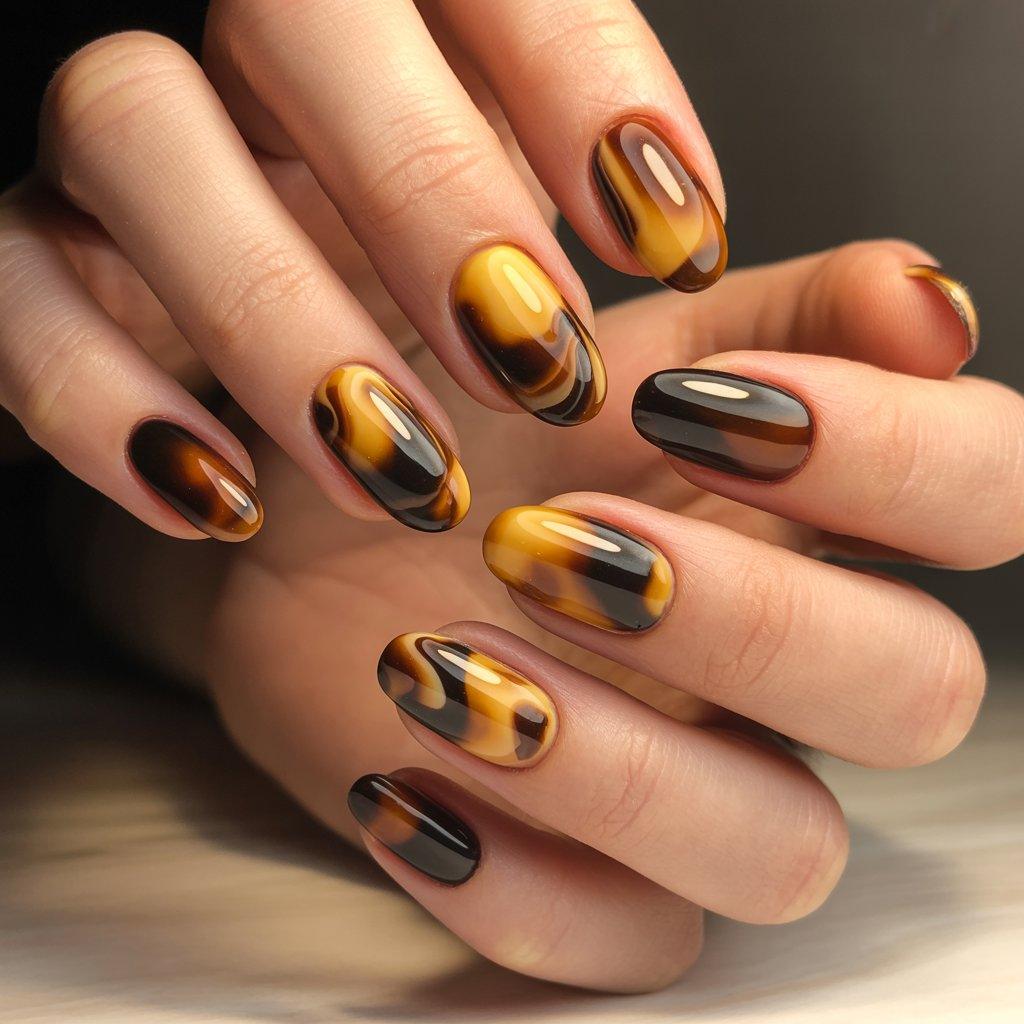 Tortoiseshell isn’t just for glasses and hair clips anymore. It’s showing up on nails and looks way better than you’d expect. It’s layers of amber, brown, and black swirled together to look like actual tortoiseshell material. You start with a sheer amber or honey base, then add small irregular patches of darker brown and black, swirling them slightly while wet.
